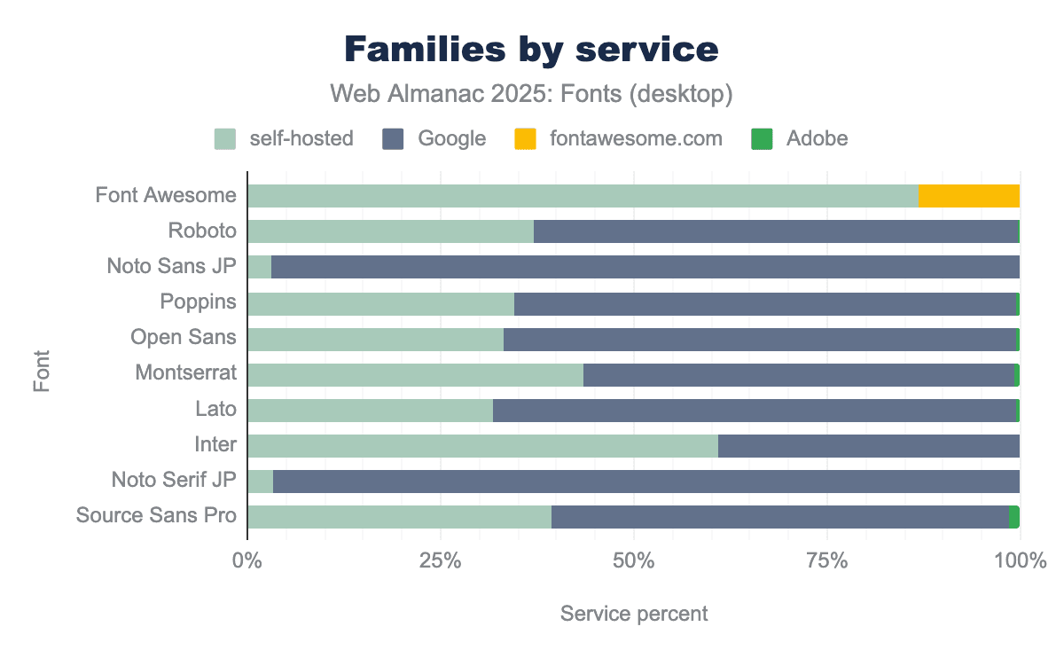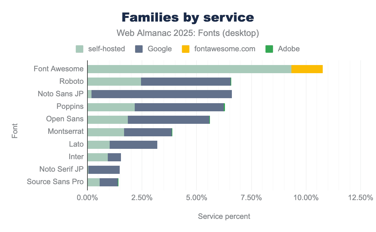 Every other service is essentially negligible at the web scale. Legacy services like Monotype’s Fonts.com, Extensis, Cloud.Typography, and Type Network each account for well under 1% of sites. Many of these have declined to the point of near-invisibility in our crawl data. In practical terms, if a website is using a hosted font service in 2025, it’s almost certainly Google Fonts. There’s a small chance it’s Adobe Fonts or Font Awesome, and very little chance that it’s something else.