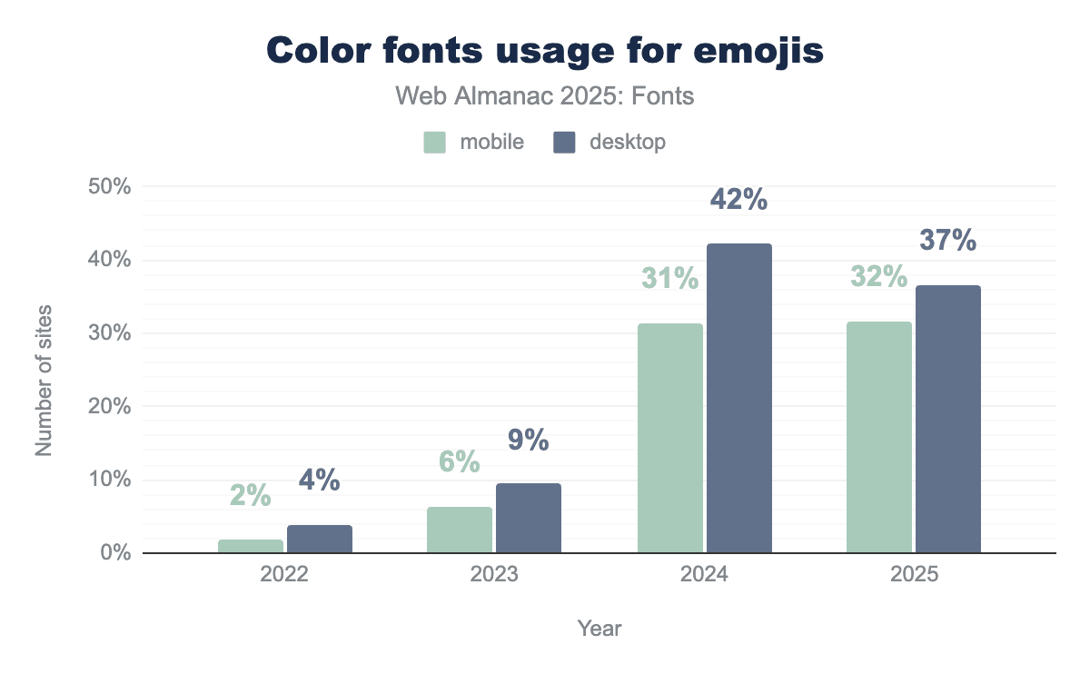 Color fonts (a new technology offering fonts with multicolored glyphs, often for emoji or icons) have been an intriguing technology, but their adoption on the web remains extremely limited. The 2025 data shows a slight increase from an almost nonexistent base, but they’re still far from mainstream.