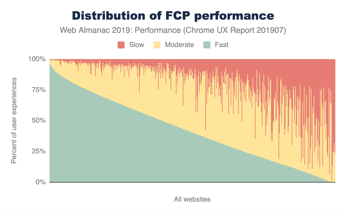 図7.1では、FCPの体験がWeb全体でどのように分散しているかを見ることができます。このチャートは、CrUXデータセット内にある数百万のWebサイト分布を1,000個のWebサイトに圧縮しており、図の縦線一つ一つはWebサイトを表しています。このグラフは、1秒未満の高速なFCP体験、3秒以上かかる遅い体験、その中間にある適度な体験(以前は平均と言われていた)の割合で並べられています。グラフには、ほぼ100%高速な体験を備えたWebサイトと、ほぼ100%低速な体験となっているWebサイトが存在しています。その中間にある、高速、適度、及び低速のパフォーマンスが混じり合ったWebサイトは、低速よりも適度か高速に傾いており、良い結果になっています。