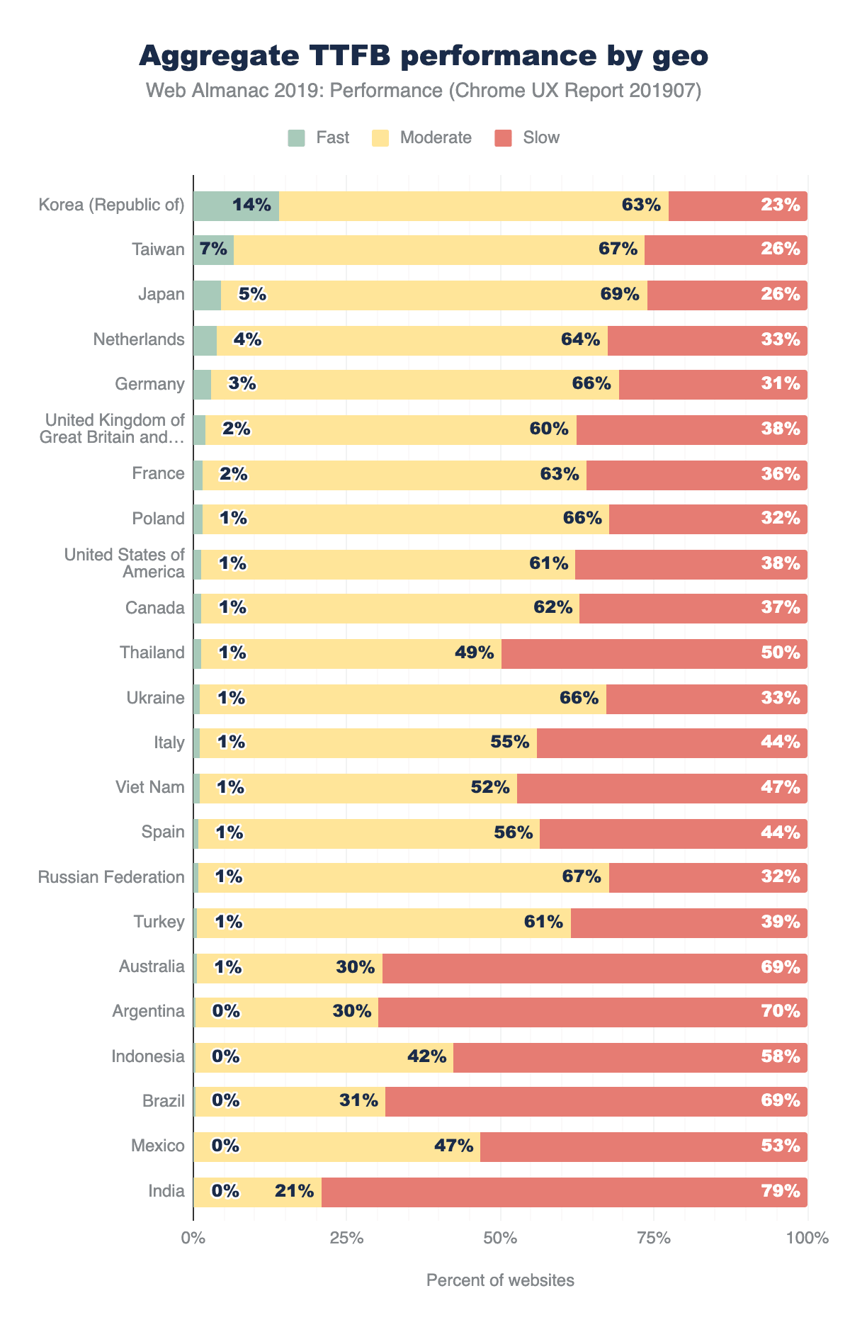 次に、さまざまな地域で、高速なTTFBをユーザーに提供しているWebサイトの割合を見てみましょう。韓国、台湾、日本のようなAPAC地域は依然として世界のユーザーを上回っています。しかし、どの地域も15%を超えてた高速なTTFBとなっているWebサイトはありません。インドでは、高速TTFBとなっているWebサイトは1%未満で、低速なTTFBとなっているWebサイトは79%となっています。