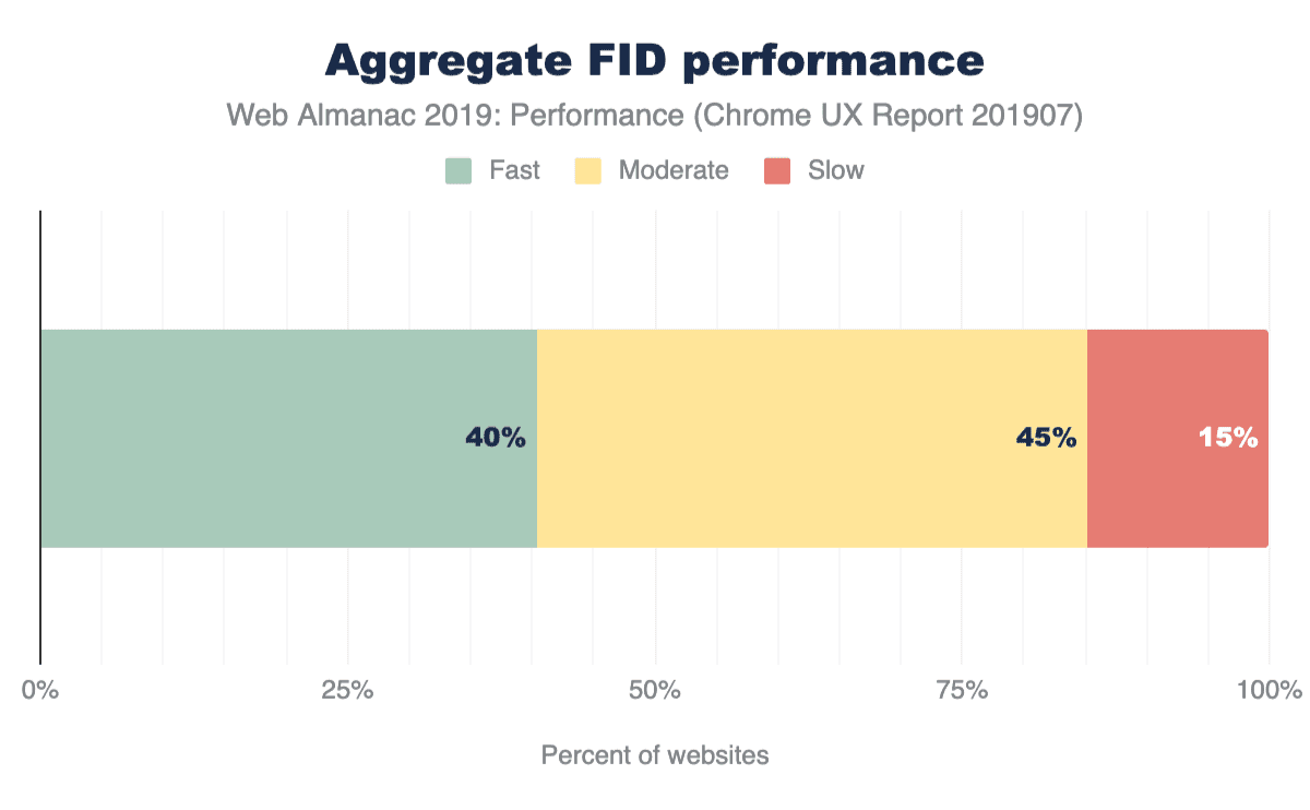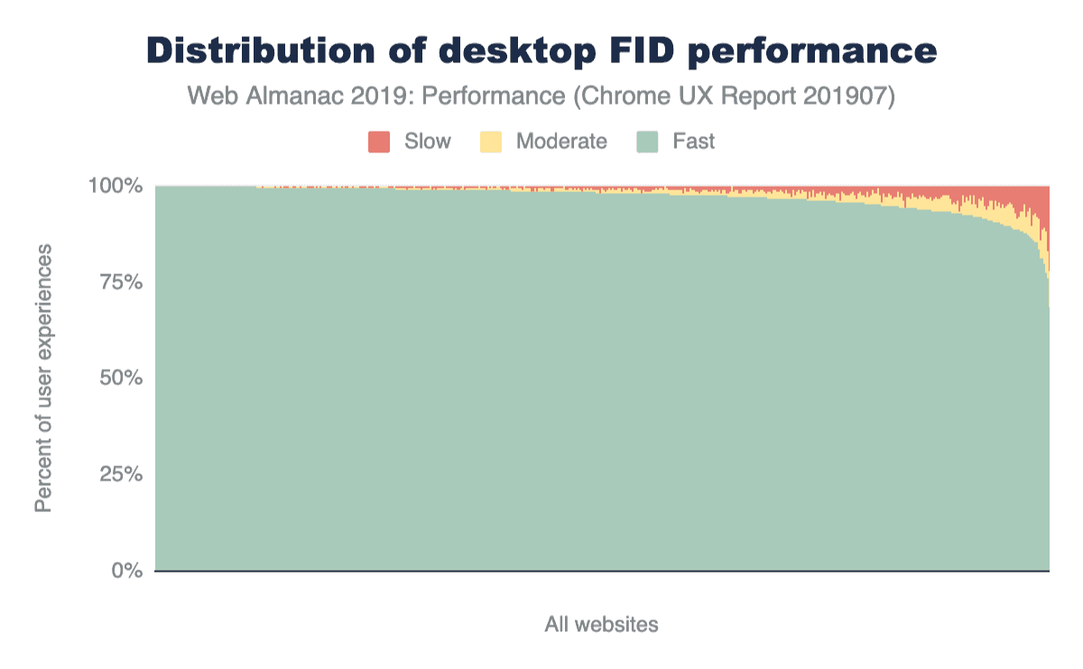 貴方はいま難題を抱えています。この表はWebサイトの高速、適度、低速のFID体験の分布を表しています。これは以前のFCPとTTFBの表とは劇的に異なります。(図7.1と図7.9をそれぞれ見る).高速FIDの曲線は100%から75%にゆるやかに下っていき、その後急降下します。FIDの体験は、ほとんどのWebサイトでほぼ高速になっています。