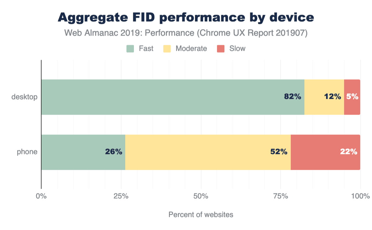 PSIラベルをデスクトップと携帯電話の体験に適用してみると、差分が非常に明瞭になります。デスクトップユーザーが経験するWebサイトの82%はFIDが高速であるのに対し、低速は5%だけです。モバイルで体験するWebサイトは、26%が高速であり、22%が低速です。フォームファクターは、FIDなどの対話性計測の成果に大きな役割を果たします。