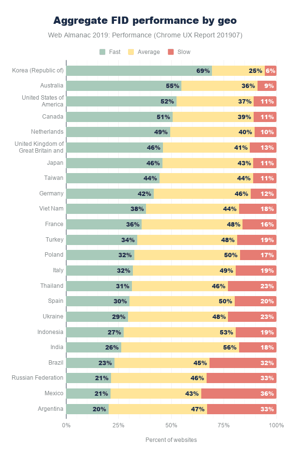 上記のECTの結果からは、接続速度とFIDパフォーマンスの間に相関関係があることが示されています。ユーザーの有効な接続の速度が低下すると、高速なFIDを体験するWebサイトの割合も低下しています。4GのECTを使うユーザーがアクセスするWebサイトの41%は高速なFIDで、3Gは22%、2Gは19%、低速な2Gは15%です。