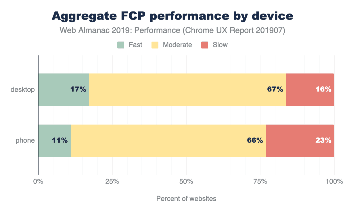 図7.2の結果は、Webサイトの13%だけが高速と判断されています。これはまだ改善の余地があるようですが、多くのWebサイトで意味を持つコンテンツを素早く一貫して描画できています。Webサイトの3分の2は適度のFCP体験となっているようです。