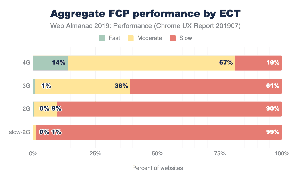 上の図7.6にあるFCP体験は、ユーザーの体験するECT毎にグループ化されています。興味深いことに、ECTの速度と高速FCPを提供するWebサイトの割合との間には相関関係があります。ECTの速度が低下すると、高速な体験の割合はゼロに近づきます。ECTが4Gのユーザーにサービスを提供しているWebサイトの14%は高速なFCPエクスペリエンスを提供していますが、そのWebサイトの19%は低速な体験を提供しています。61%のWebサイトは、ECTが3Gのユーザーに低速のFCPを提供し、ECTが2Gだと90%に、ETCが低速の2Gだと99%となっています。これらの事実から、4Gより遅い接続を持つユーザーには、Webサイトがほぼ一貫して高速のFCPを提供できていないことを示しています。