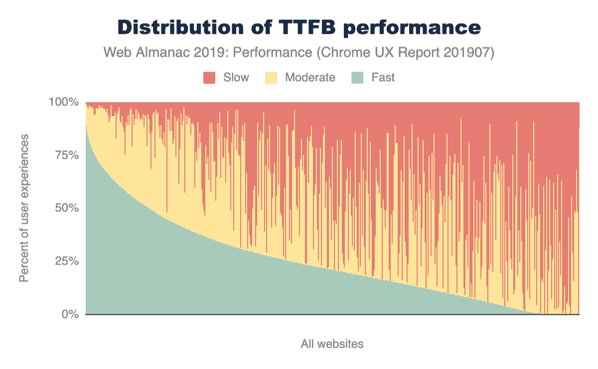 以前にFCPで使用したPSI方法論からインスピレーションを貰って、TTFB速度のラベルを各Webサイトに適用しましょう。ウェブサイトが75%以上のユーザー体験に対して高速なTTFBを提供する場合、高速とラベル付けされます。それ以外に、25%以上のユーザー体験に対して低速 なTTFBを提供するものを、低速とします。この条件のどちらでもないものを適度とします