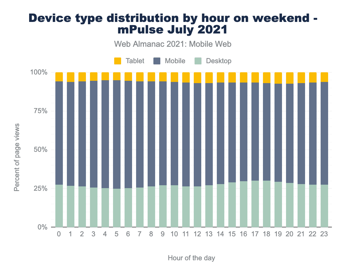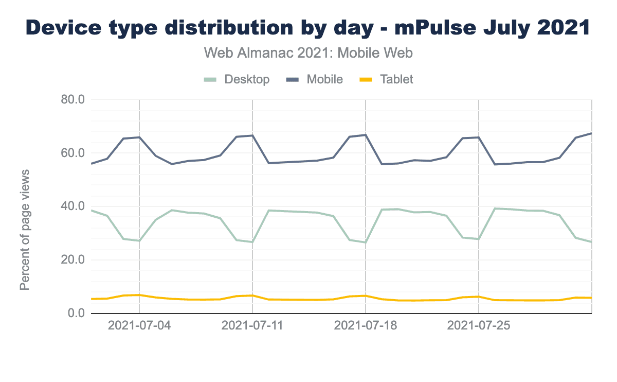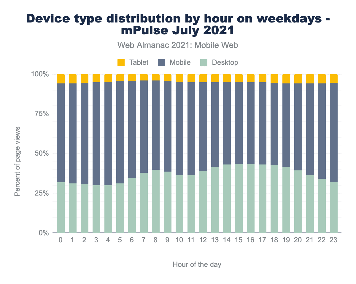 幸いなことに、他にもいくつかの資料があります。Paul Calvanoは、2021年7月の Akamai mPulse リアルユーザー モニタリング データについて、いくつかの分析を実施しました。また、モバイル端末からのトラフィックは59.4%で、モバイル端末とデスクトップ端末の比率はやや拮抗していることがわかりました。mPulseのデータは1時間ごとに集計されているため、いくつかの興味深い傾向を見ることができます。