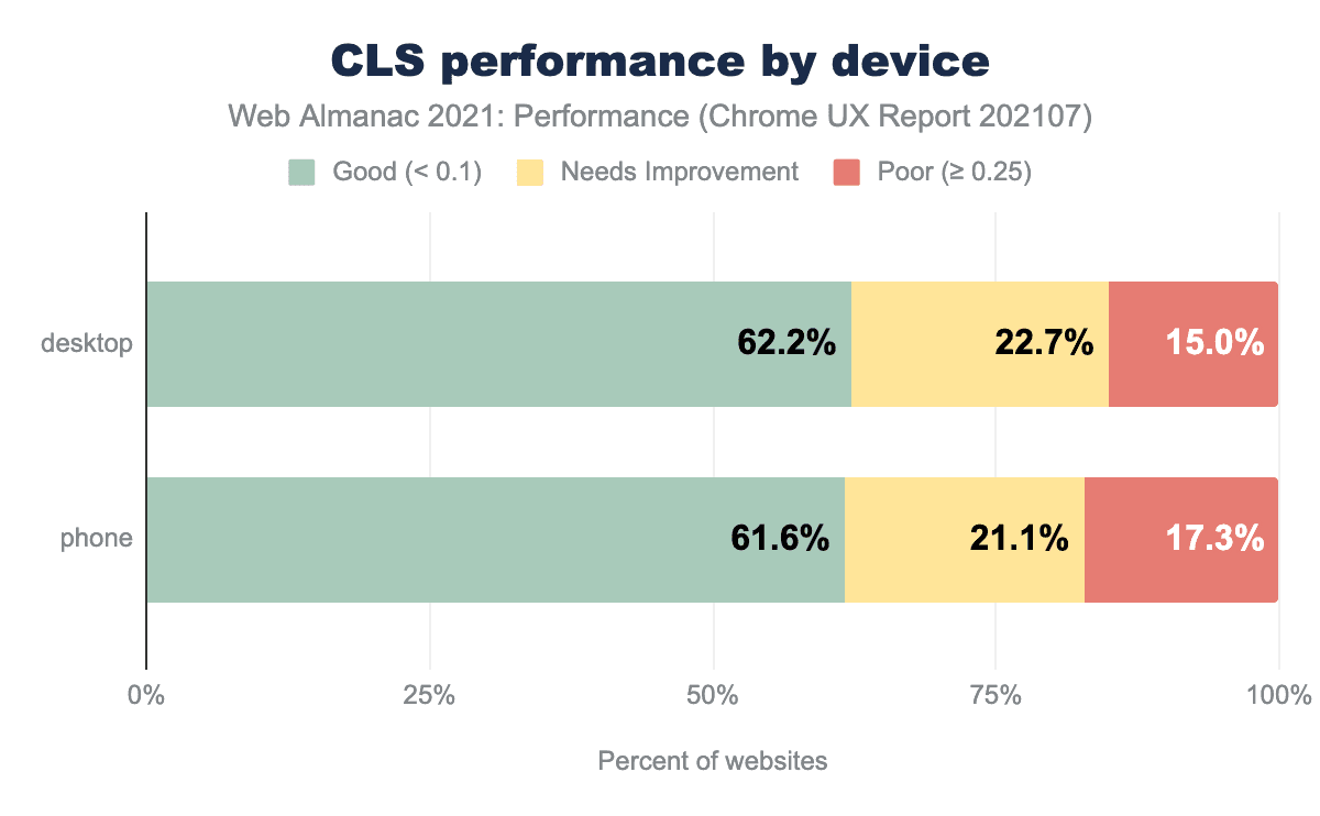 CrUXデータセットによると、モバイルページの読み込みの62%でCLSが、0.1以下であったことが示されています。