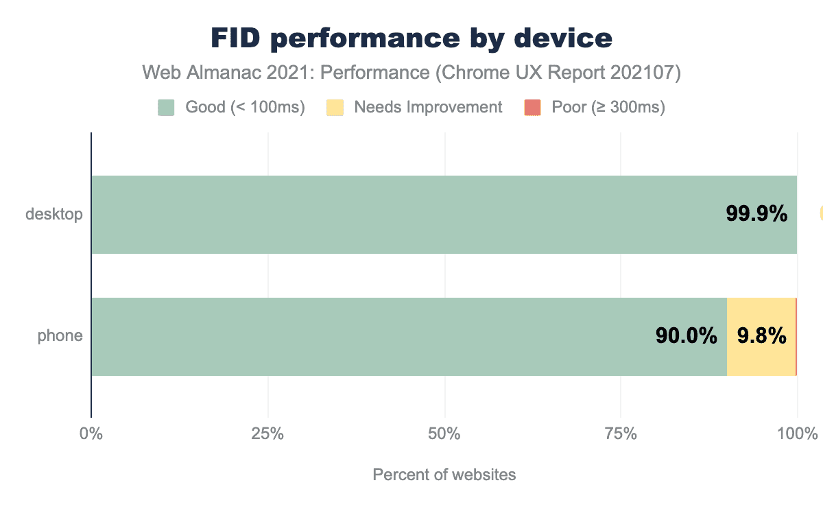 心強いことに、CrUXデータセットのモバイルページロードの90%が良好なFIDスコアを獲得し、2020年の80%から上昇しました。