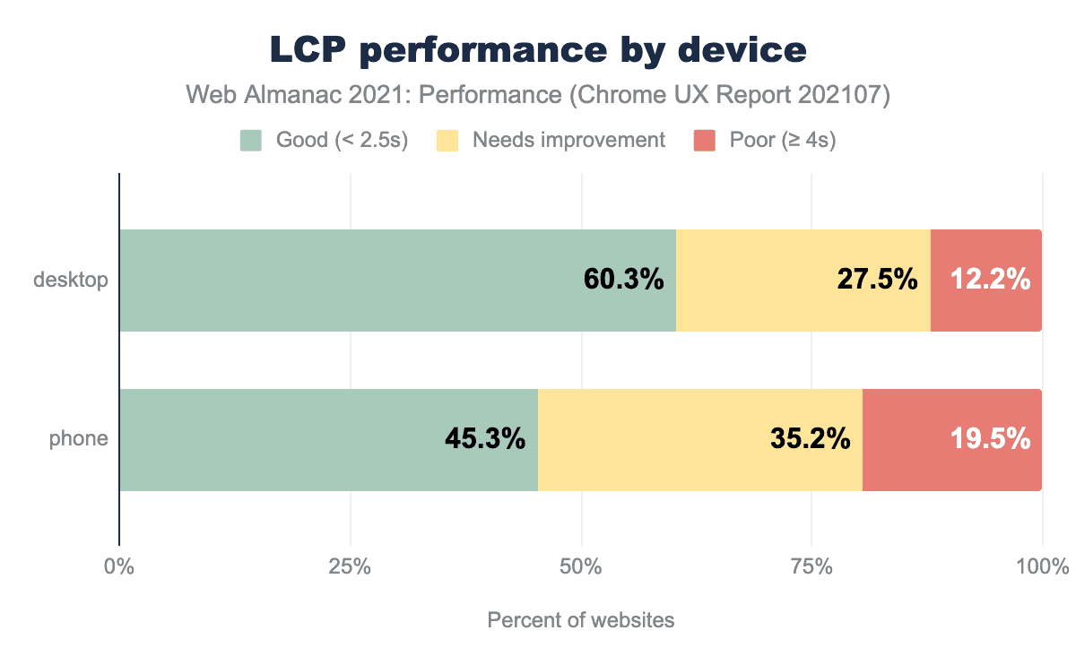 このデータによると、CrUXのデータセットに記録されたモバイルページの読み込みのうち、2.5秒以下の目標を達成しているのはわずか45%で、デスクトップの60%よりはるかに低いことがわかります。