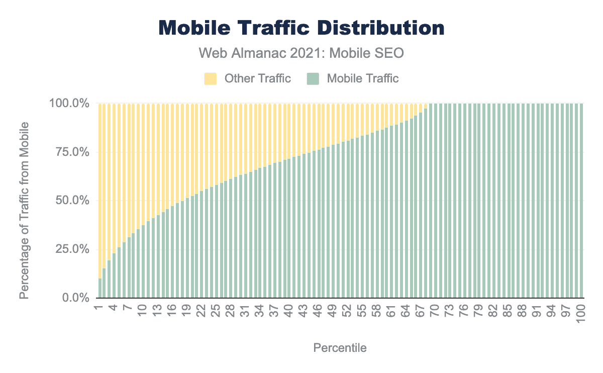分布も同様に、モバイルヘビーな傾向を示しています。50パーセンタイルでは、トラフィックの79.4%がモバイルデバイスからのもので、2020年の77.6%を上回り、2019年の79.9%に追いついています。