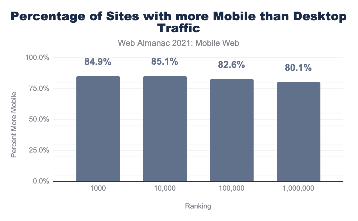 CrUXランキング(データセット内のトラフィック上位1,000、10,000など)でグループ化すると、トラフィックが多いサイトほど、モバイルからのトラフィックの割合がわずかに増加します。上位1,000を除くすべてのサイトは、デスクトップに対してモバイルがわずかに少なく(84.9%対85.1%)なっています。