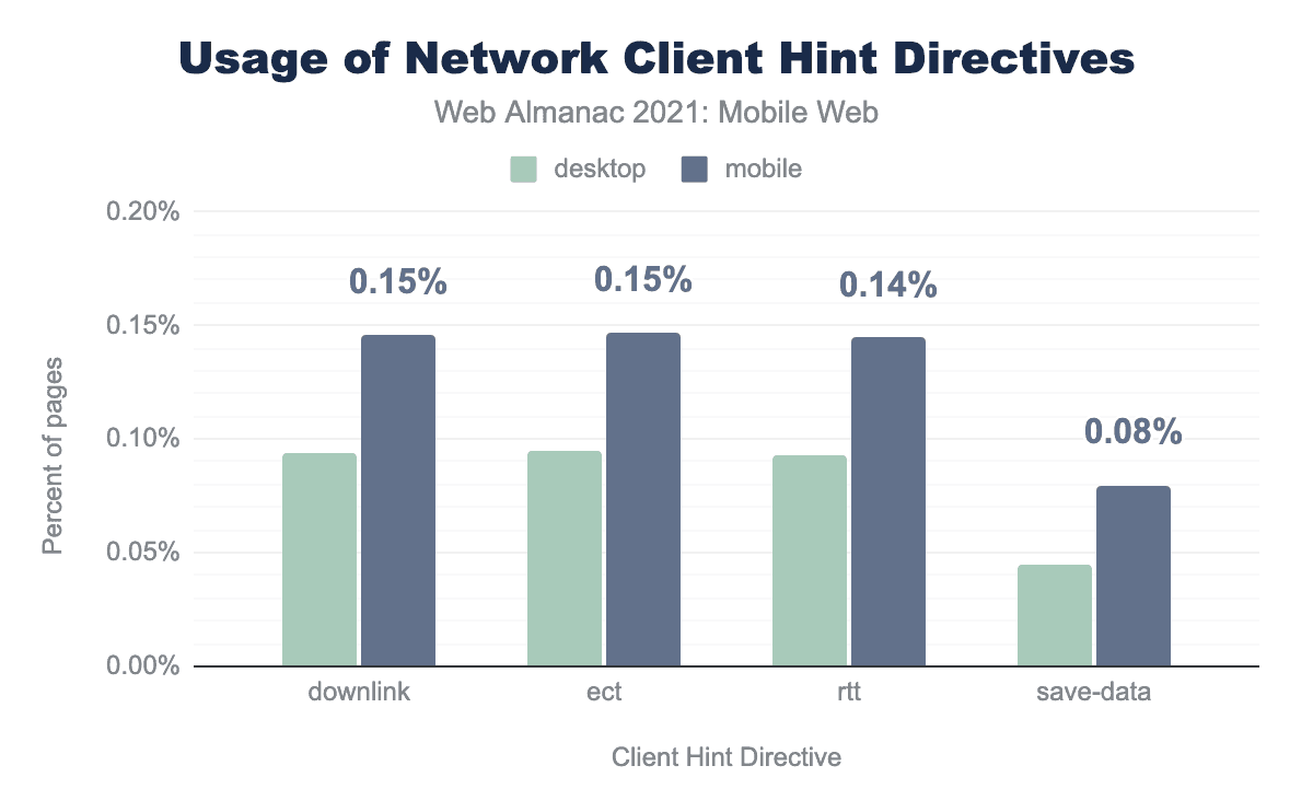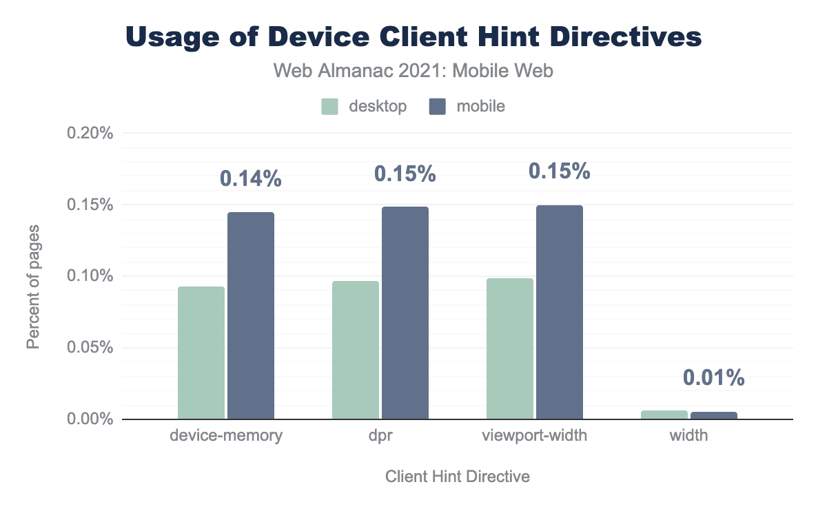 HTTPクライアントヒントは比較的新しい機能で、RFCは今年の2月に発行されたばかりで、やや実験的なものです。したがって、1.4%のサイトがモバイルユーザーに対して少なくとも1つのクライアントヒントを要求していることがわかったのは、非常に心強いことです。