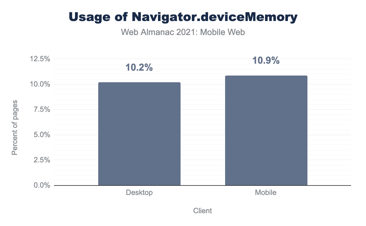 Navigator.deviceMemoryAPI の使用状況を比較した棒グラフです。デスクトップサイトの10.2%がDevice Memory APIを使用したのに対し、モバイルのページロードでは10.9%でした。Navigator.deviceMemoryの使用法。