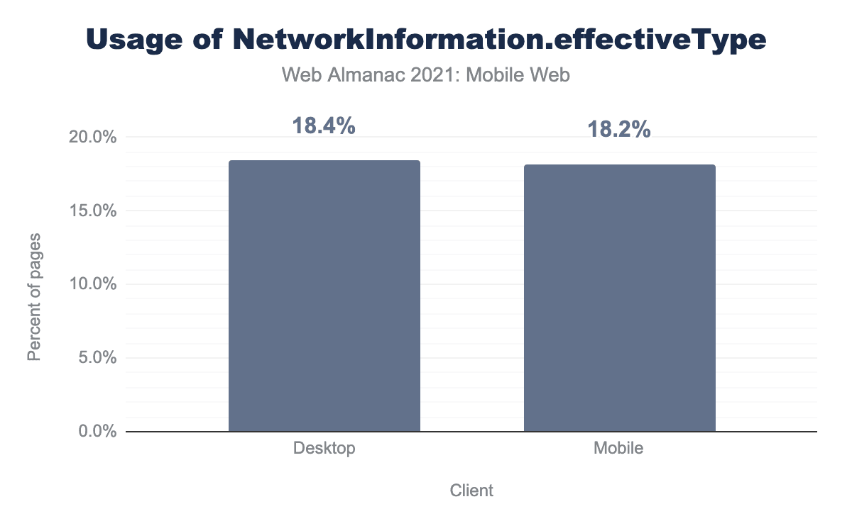 モバイルリクエストの18.2%に NetworkInformation.effectiveType を利用したページロードがありましたが、驚くべきことに、デスクトップリクエストの18.4%がこのAPIの利用を検知しています。