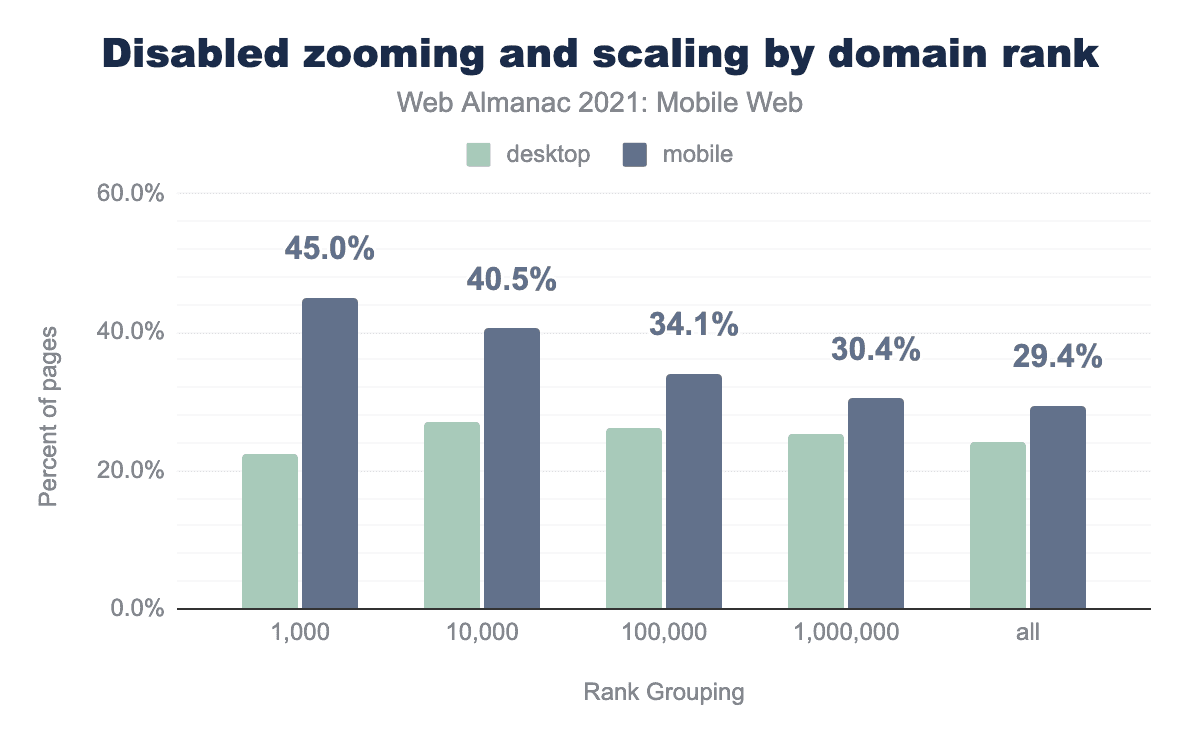 残念なことに、モバイルページの29.4%がこの要件を満たせず、ズームを妨げるビューポートを含んでいました。(引用元:2020 Web Almanacアクセシビリティの章)