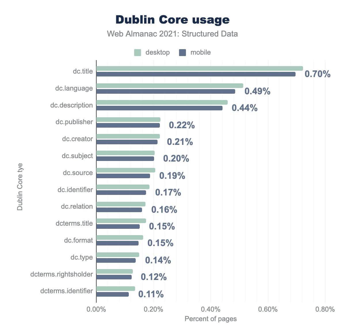 もっとも人気のある属性タイプはdc:title(0.70%のページ)であることは、驚くにはあたらない。しかし、dc:languageが0.49%の普及率で(descriptionsubjectpublisherなどの一般的な記述子より)次にあるのは興味深いことです。これは、Dublin Coreが多言語のメタデータ管理システムでよく使われていることを考えると、納得がいく。