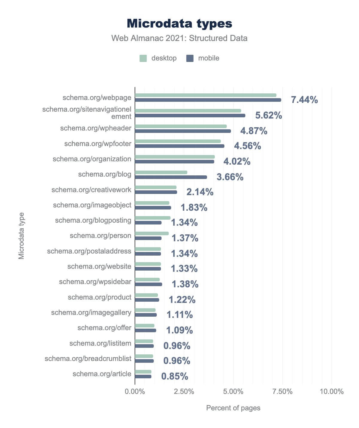 分析したページでもっとも一般的なmicrodataのタイプは、Webページそのものを記述するもので、webpage(7.44%のページ)、sitenavigationelement(5.62%のページ)、wpheader(4.87% of pages)とwpfooter(4.56% of pages)などのプロパティが利用されました。