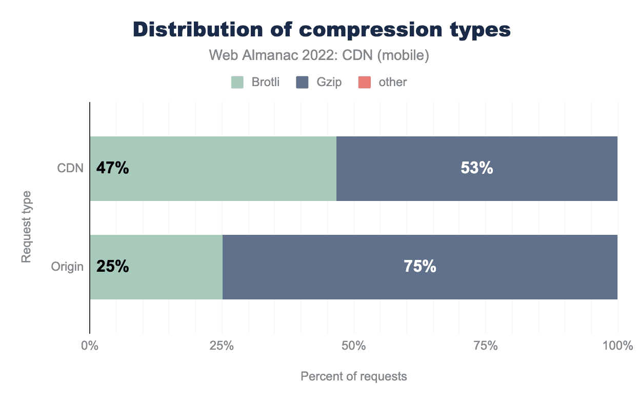 CDNとオリジンはともに、前年と比較してBrotliの採用が増加しています。CDNでのBrotliの採用は5ポイント増加し、オリジンはほぼ4ポイント増加しました。この傾向が2023年に続くか、または飽和点に達したかどうかを確認することができるでしょう。