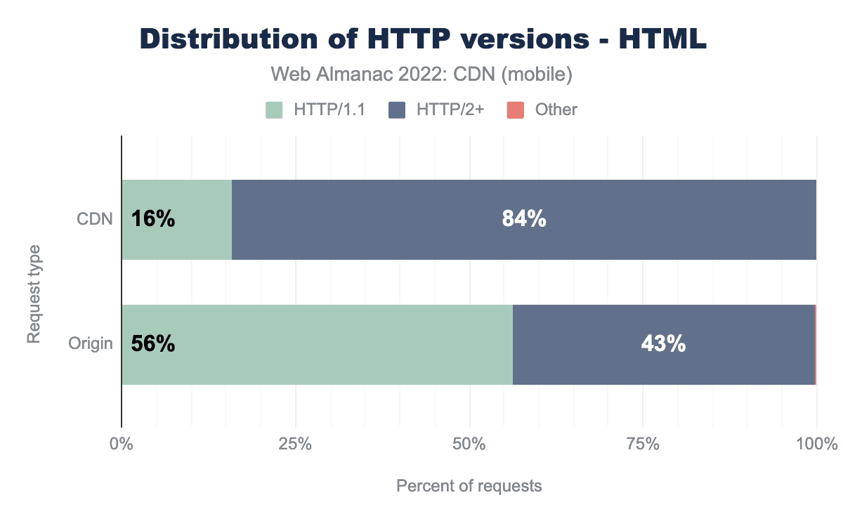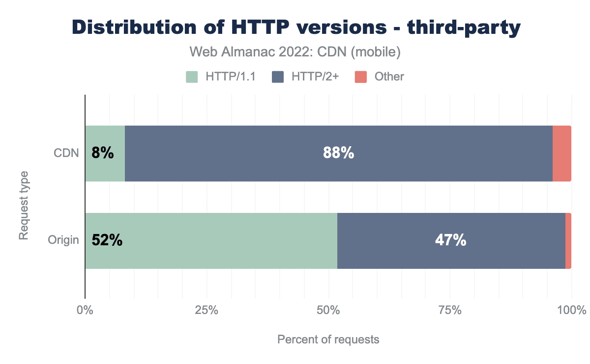 2021年には、オリジンから提供されるコンテンツの約40%がHTTP/2を採用していましたが、同時期にCDNから提供されるコンテンツの81%がHTTP/2を通じて提供されました。オリジンのこの数値は3ポイント増加しましたが、CDNの場合は6ポイント増加し、すでに存在していたかなりの差がさらに広がりました。これは、CDNがウェブサイトオーナーが初期段階から新しいプロトコルを利用できるようにする方法を示しています。