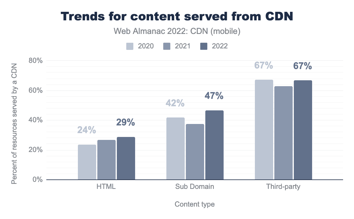 2021年と比較して、CDNの使用が着実に増加していることがわかりました。サブドメインから提供されるコンテンツのCDN使用に大きな増加があり、HTMLの増加は小さく、サードパーティのCDN使用は比較的一定でした。