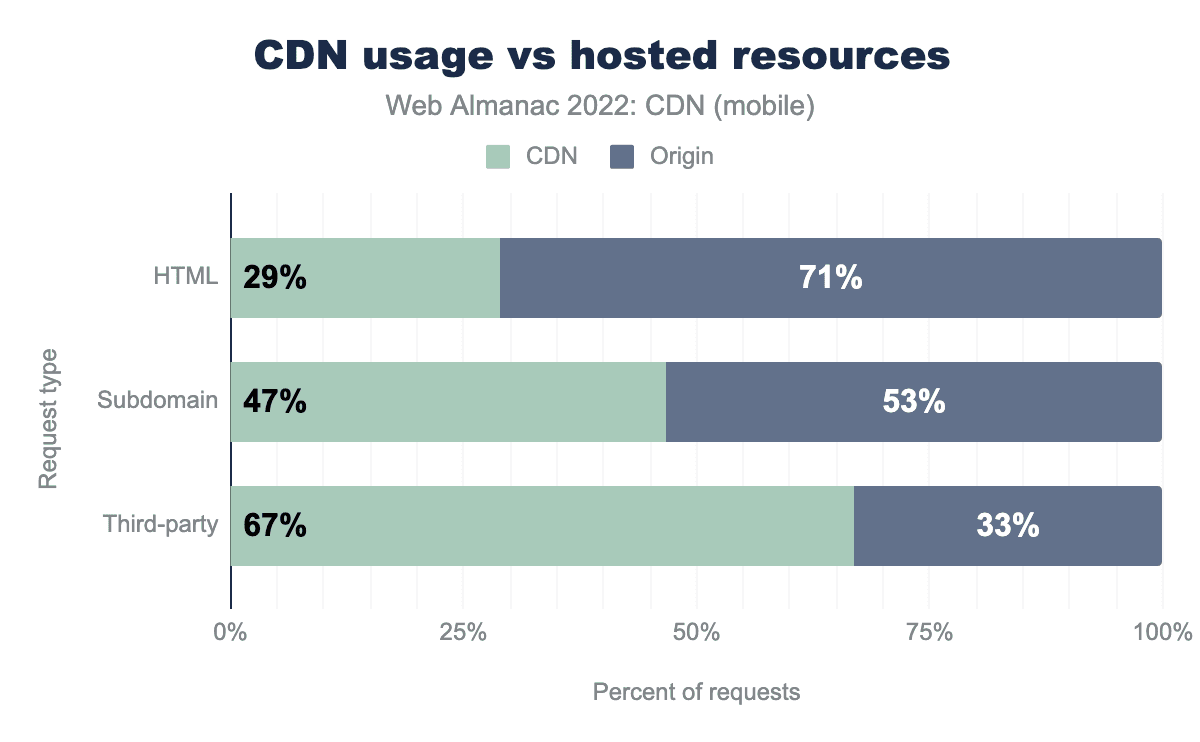 上のグラフは、デスクトップでもほぼ同じ数字が見られたため、モバイルの各種リクエストのCDN対ホストリソースの分割を示しています。CDNはしばしば画像、スタイルシート、JavaScript、フォントなどの静的コンテンツの配信に利用されます。この種のコンテンツは頻繁に変更されないため、CDNのプロキシサーバーでキャッシュするのに適しています。とくにサードパーティコンテンツについては、この種のリソースでCDNがより頻繁に使用されています。