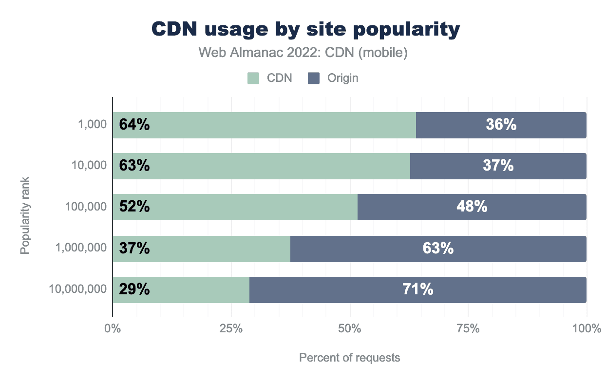 GoogleのChrome UX Reportからのデータに基づいてウェブサイトの人気によるCDNの使用を見ると、トップ1,000-10,000がCDNのもっとも高い使用率を示しています。ランクの高いサイトでは、所有者の企業がパフォーマンスとその他の利点のためにCDNに投資していることが理解できますが、トップ1,000,000のサイトでも、CDNを通じて配信されるコンテンツの量が2021年と比較して約7%増加しています。人気の低いサイトでのCDNの使用の増加は、CDNの無料または手頃なオプションの増加と、多くのホスティングソリューションがサービスにCDNを組み込んでいるためと考えられます。