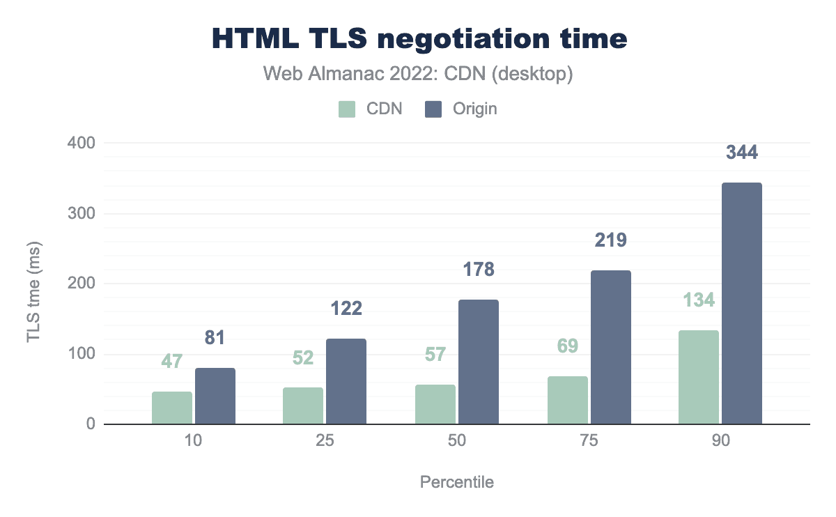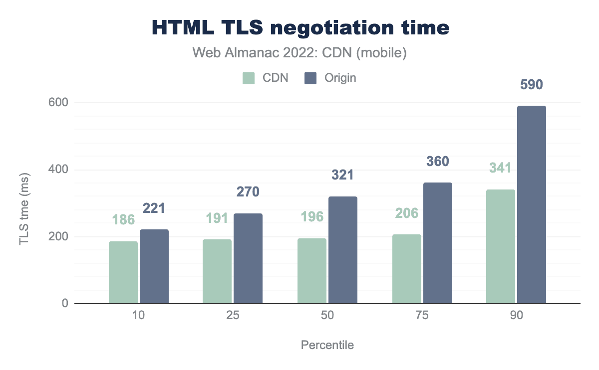 これは、すべてのサイトが現在TLSを使用していることを考慮するととくに重要です。この層での最適なパフォーマンスは、TLS接続に続く他のステップにとって不可欠です。この点で、CDNは直接オリジン接続に比べてより多くのユーザーを低いパーセンタイルブラケットに移動させることができます。