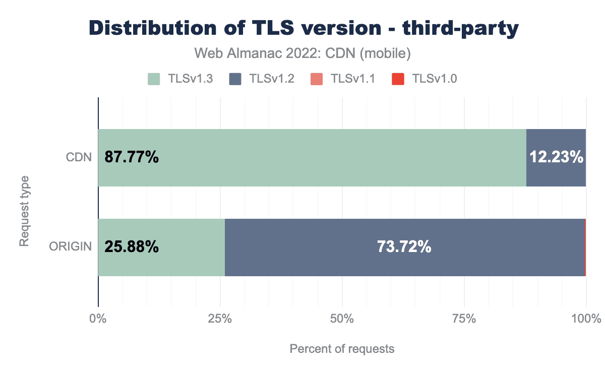 下記のグラフは、CDNから提供されるコンテンツとオリジンから提供されるコンテンツとを比較した際、最新バージョンのTLSの採用率がCDNの方がはるかに高いことを示しています。
