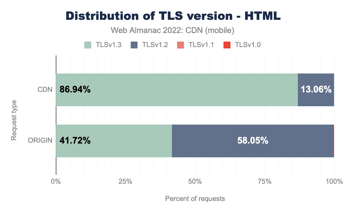 2021年のデータと比較すると、モバイルHTMLコンテンツにおけるTLS v1.3の採用は5%増加していますが、オリジンから提供されるコンテンツの場合はTLS v1.3の採用が10%増加しています。