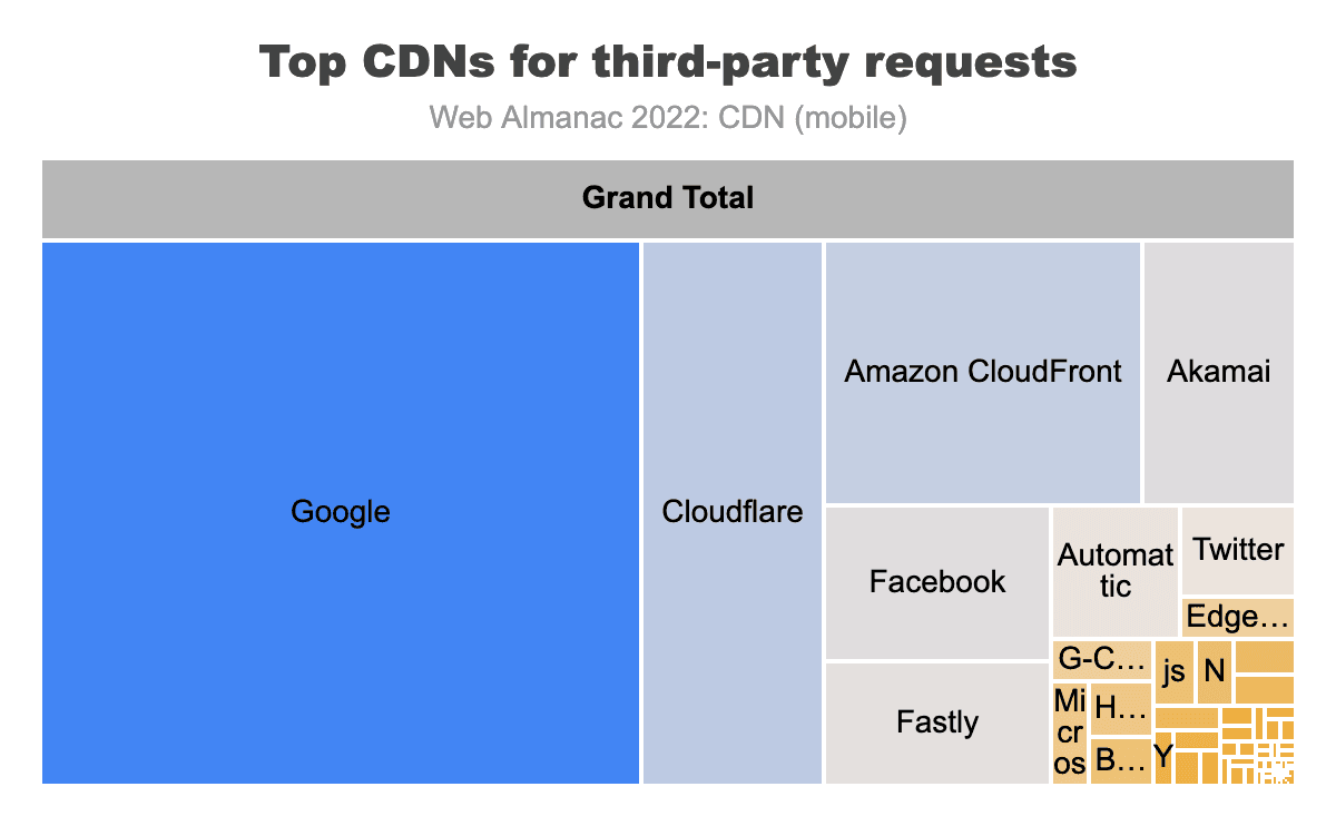 あらゆる観察研究と同様に、測定できる範囲と影響には限界があります。Web AlmanacのCDN使用に関する統計は、使用されている適用技術により焦点を当てており、特定のCDNベンダーのパフォーマンスや効果を測定することを目的としていません。これにより、私たちはどのCDNベンダーにも偏らないことを保証しますが、これはより一般化された結果であることも意味します。