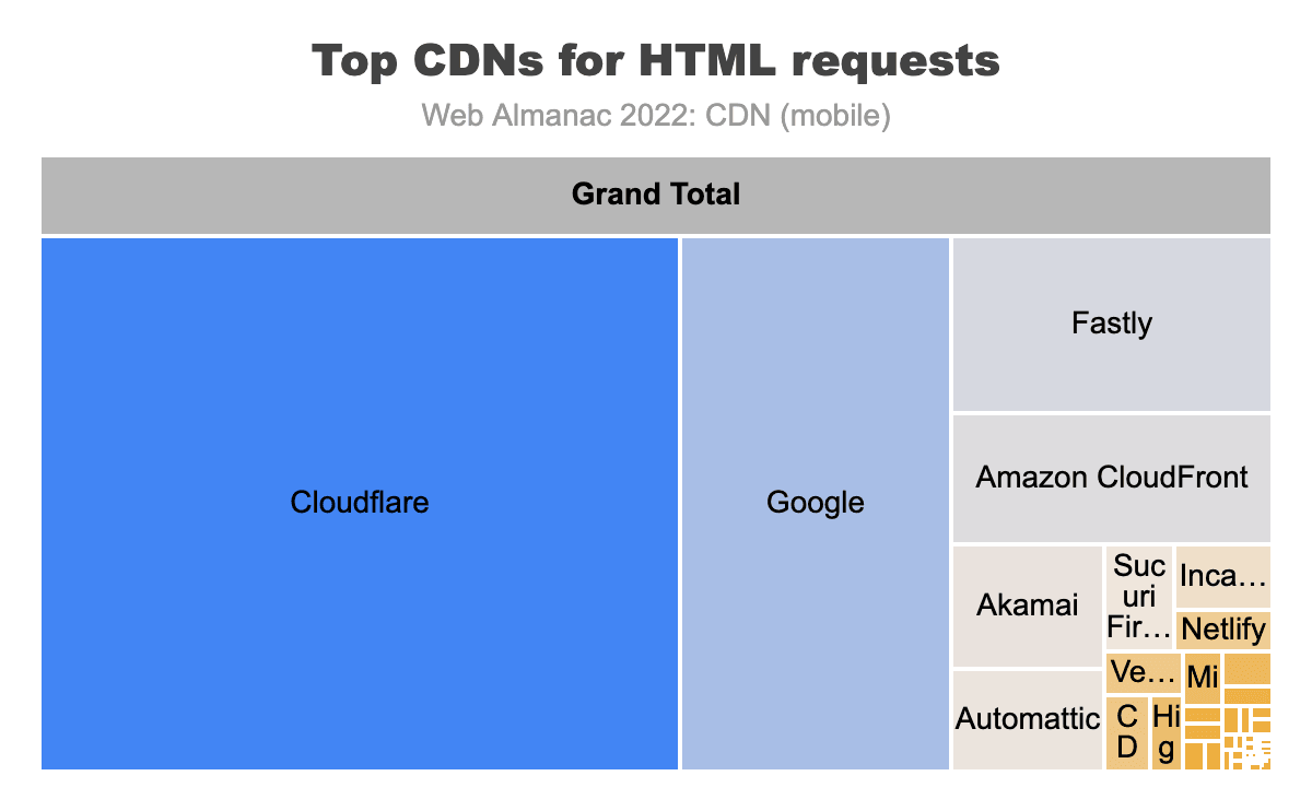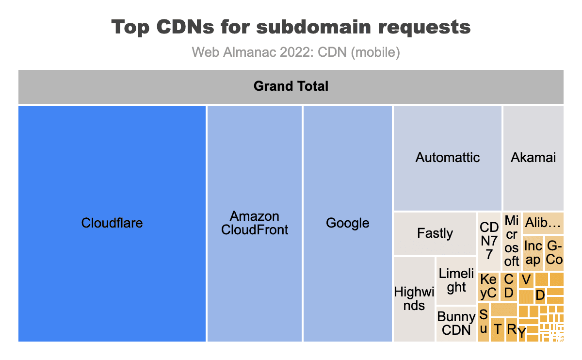 上記の図は、ベースHTMLリクエストに対する主要なCDNプロバイダーを示しています。このカテゴリーでトップのベンダーはCloudflare、Google、Fastly、Amazon CloudFront、Akamai、そしてAtomatticです。