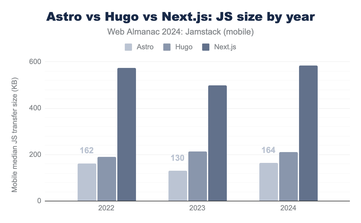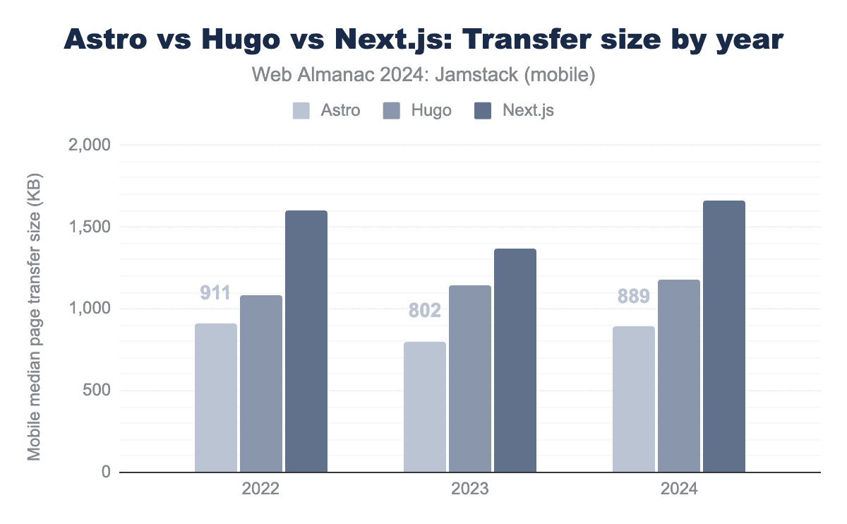 図14.15. Astro vs Hugo vs Next.js:年ごとの転送サイズ。