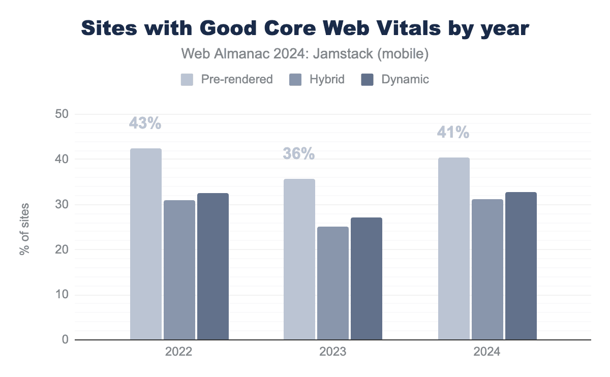 プリレンダリングは通常、より速いTime to First Byte(TTFB)をもたらし、それは自然にLCPを改善します:ブラウザがHTMLを速く受け取るほど、アセットの取得とページのレンダリングを早く開始できます。これらのサイトは、しばしば開発者によって手作りされるため、CLSのような詳細にもより注意が払われる傾向があります。ハイブリッドはJavaScriptフレームワークと最大のJavaScriptペイロードを多用しており、それが良好なコアウェブバイタルの割合がもっとも低い理由を説明している可能性があります。
