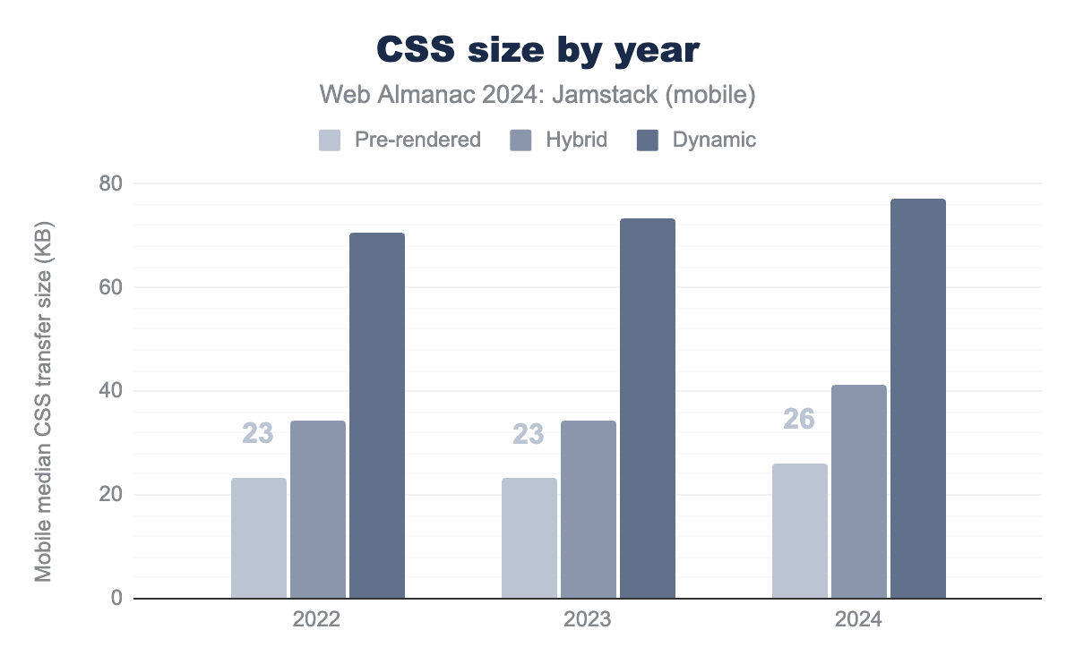 CSSの総転送量は別の視点を提供し、すべてのカテゴリでわずかな上昇傾向を示しています。ハイブリッドサイトと動的サイトの間の顕著なジャンプが目立ちます。正確な原因を特定するにはさらなる分析が必要ですが、考えられる説明としては、プリレンダリングサイトとハイブリッドサイトはウェブ開発者によって手作りされる傾向があるのに対し、動的サイトはしばしばテーマ、ウェブサイトビルダー、プラグインに依存しており、これらは肥大化したウェブアセットで悪名高いということです。