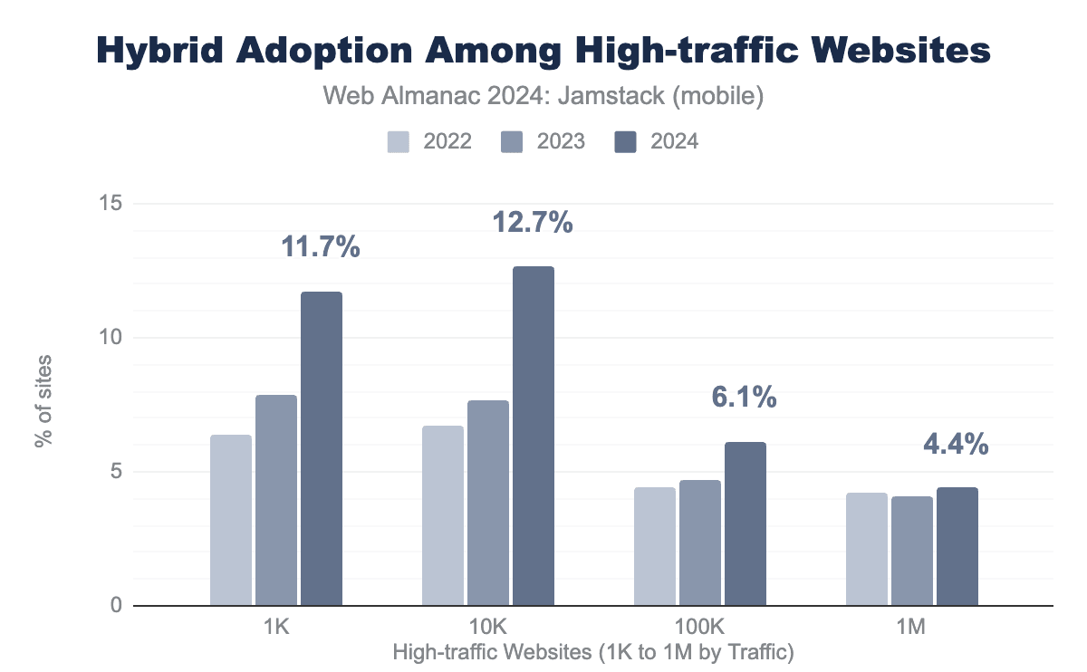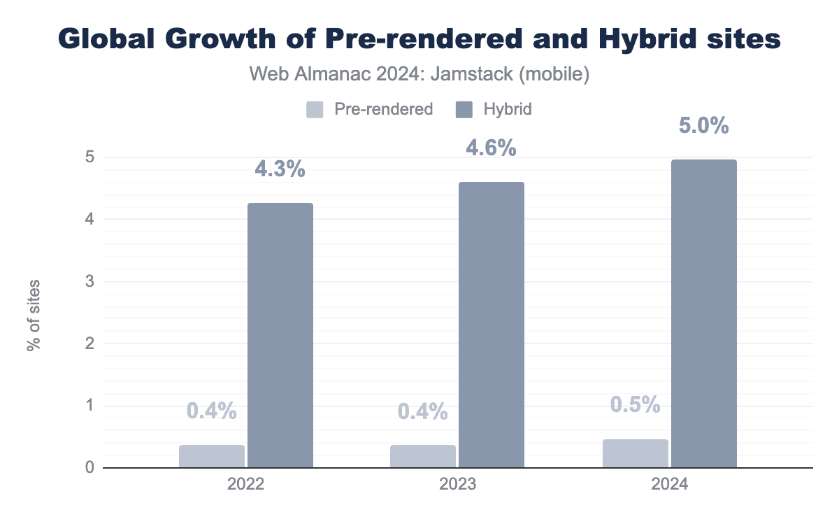 今年の際立った特徴は、2024年にトラフィックの多い上位1万のウェブサイトにおいて、プリレンダリングとハイブリッドアーキテクチャが合わせて67%も成長したことです。これらの人気サイトの12%以上が現在、これらのアプローチを使用しています。プリレンダリングとハイブリッド配信は、ウェブ全体という文脈ではまだニッチですが、その利点がもっとも評価される分野で急速に支持を得ています。