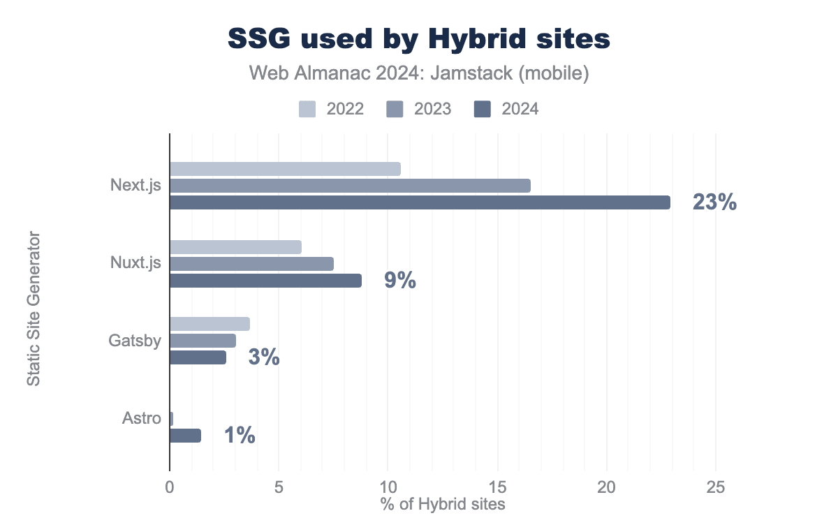 ハイブリッドカテゴリでは、Next.jsが過去1年で39%増加し、そのリードを広げていることがわかります。Next.jsは、プリレンダリング、動的レンダリング、インクリメンタル静的再生成(サイト全体のリビルドを必要とせずに特定の静的ページをオンデマンドで更新)が可能な非常に柔軟なフレームワークです。情報サイトから本格的なウェブアプリケーションまで、あらゆるものに対応できるその多様性が、使用率の増加の大きな理由の1つです。