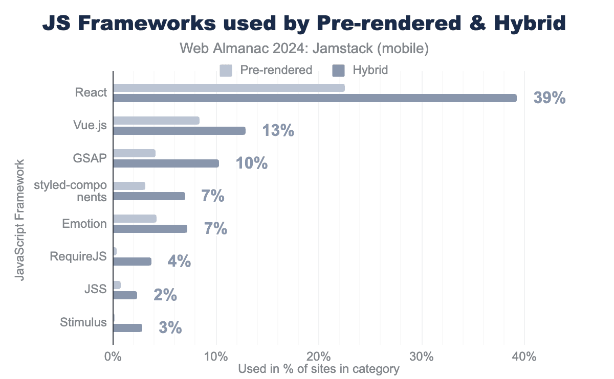 プリレンダリングされたウェブサイトとハイブリッドウェブサイトで使われるJavaScriptフレームワークを分解すると、Reactのような重いフレームワークがハイブリッドカテゴリでより一般的に使われていることがわかります。
