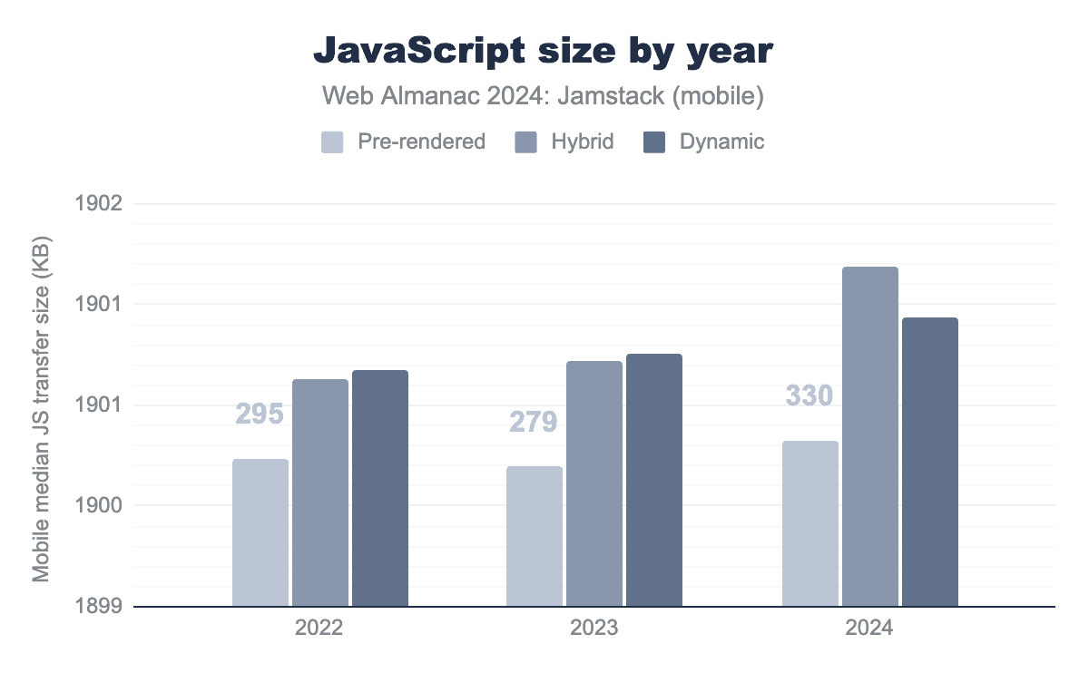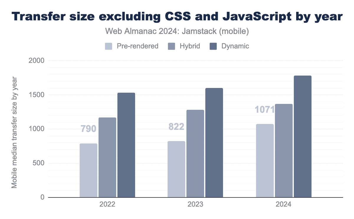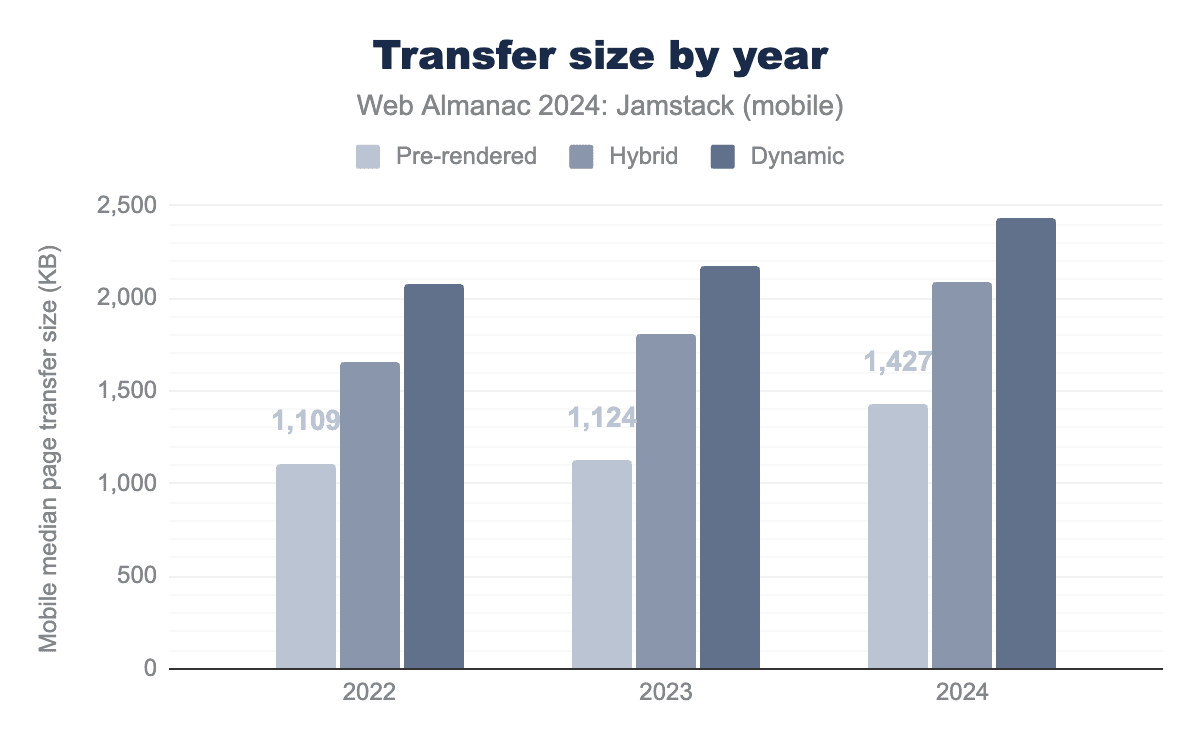 JavaScriptの総転送量は、もっとも興味深い洞察の1つを提供しており、ハイブリッドサイトのJavaScriptサイズが急激に増加し、2024年には動的カテゴリのそれを上回っています。