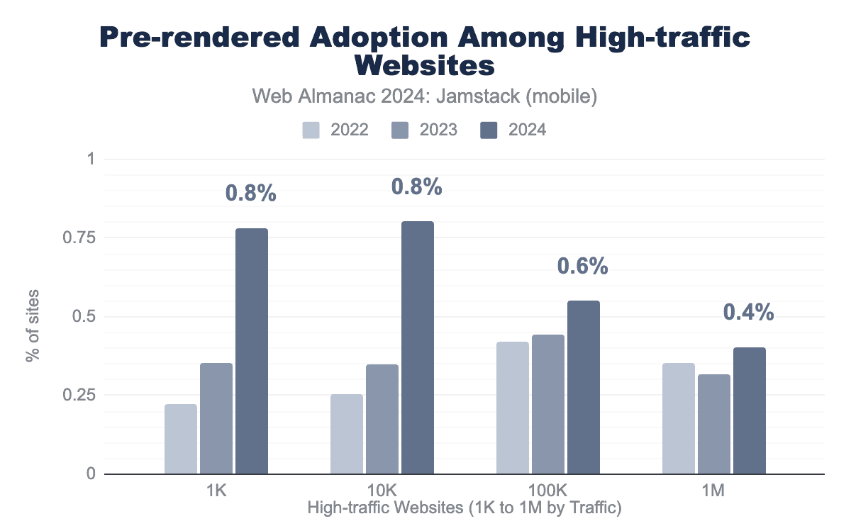 もっとも人気のある上位1kおよび10kのサイトでは、プリレンダリングの採用が大幅に増加しており、1Mマーク以降では成長が頭打ちになっています。これらの高トラフィックサイトは、パフォーマンス、SEO、セキュリティ、安定性を非常に重視しており、これらの原則はプリレンダリングアプローチと完全に一致しています。