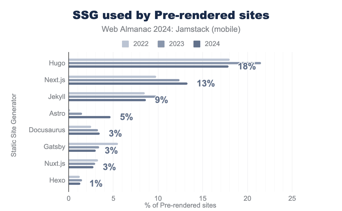 過去3年間、プリレンダリングカテゴリではHugoがかなりの差をつけてリードしているのがわかります。Hugoは高速で柔軟なSSGとして知られており、パフォーマンスを重視するコミュニティがあるため、リストのトップにいるのは驚くことではありません。