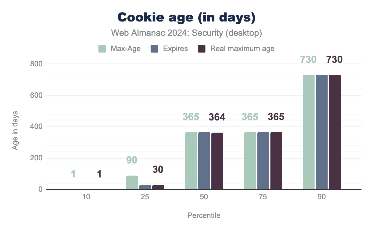 Max-Age、Expires、実際の有効期間が1日。25パーセンタイルでは、Max-Ageが90日、Expiresが60日、実際の有効期間が60日。50パーセンタイルでは、Max-Ageが365日、Expiresが365日、実際の有効期間が364日。75パーセンタイルでは、Max-Ageが365日、Expiresが365日、実際の有効期間が365日。90パーセンタイルでは、Max-Age、Expires、実際の有効期間が730日。クッキーの有効期間の分布は、昨年と比較してほとんど変わっていません。しかし、それ以来、クッキー標準の作業草案が更新され、クッキーの最大有効期間が400日に制限されました。この変更はすでにChromeとSafariで実装されています。上記のパーセンタイルに基づくと、これらのブラウザでは、観測されたすべてのクッキーの10%以上が、この400日の制限に有効期間が上限付けられています。