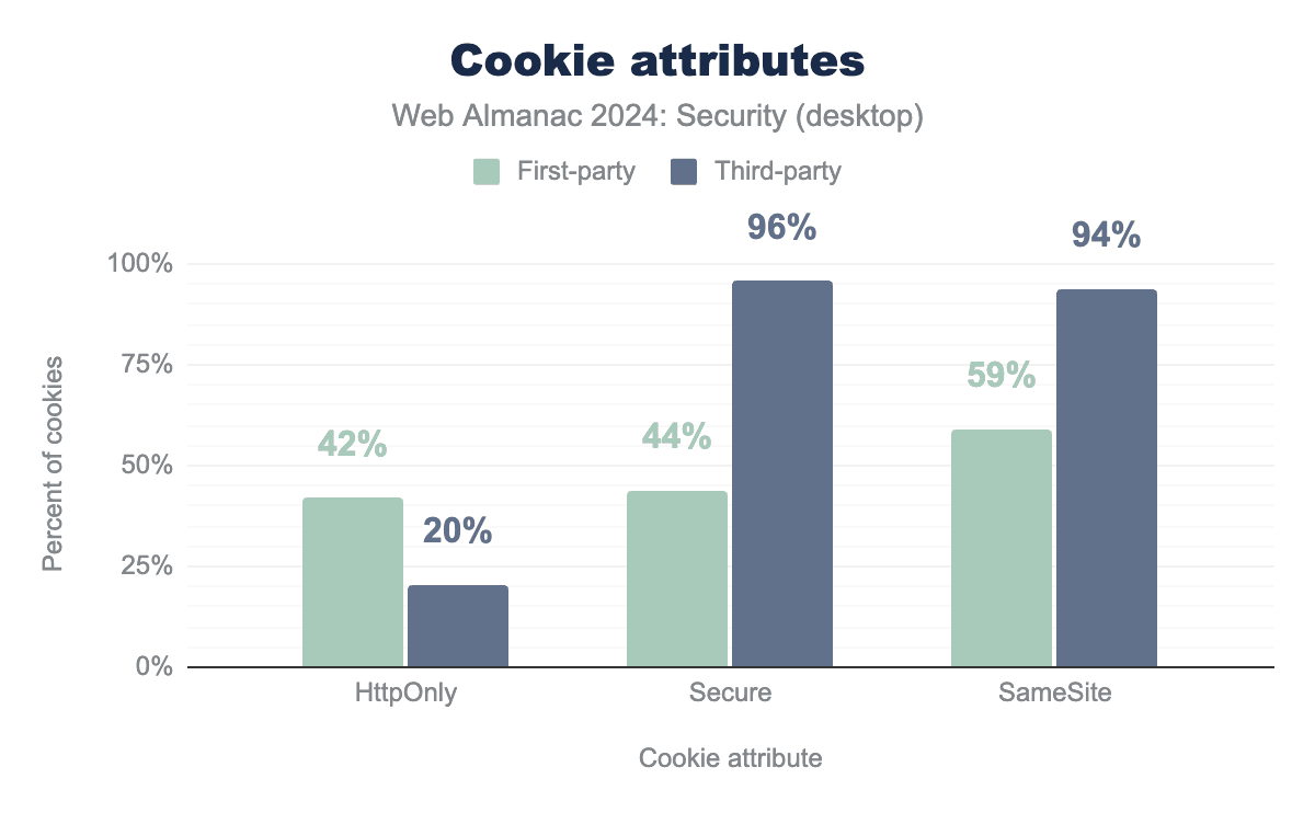 HttpOnlyが42%、Secureが44%、SameSiteが59%使用されているのに対し、サードパーティではHttpOnlyが20%、Secureが96%、SameSiteが94%使用されています。