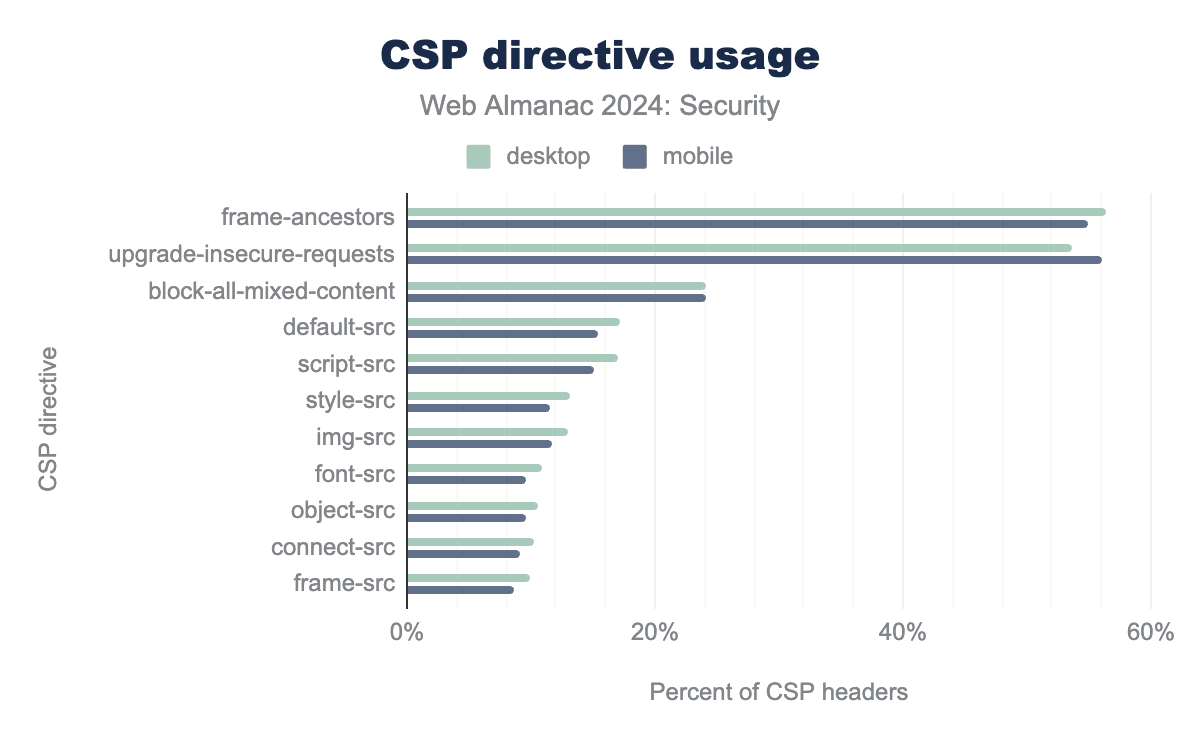 ほとんどのウェブサイトは、埋め込みリソースの制御以外の目的でCSPを利用しており、upgrade-insecure-requestsとframe-ancestorsディレクティブがもっとも人気があります。