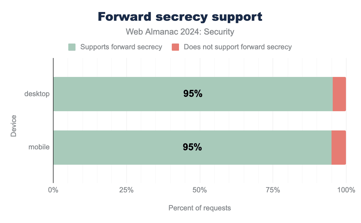 AES_128_GCMがもっとも一般的で、デスクトップサイトの79%、モバイルサイトの79%で使用されています。AES_256_GCMはデスクトップサイトの20%、モバイルサイトの20%で使用されています。AES_256_CBCはデスクトップサイトの1%、モバイルサイトの1%で使用されています。CHACHA20_POLY1305はそれぞれ0%と0%のサイトで使用され、AES_128_CBCはそれぞれ0%と0%で使用されています。TLS1.3は前方秘匿性を必須としているため、ウェブ上で広くサポートされています。前方秘匿性とは、使用中の鍵が漏洩した場合でも、その鍵を使用して接続上で送受信された将来または過去のメッセージを復号できないことを保証する機能です。これは、長期的なトラフィックを保存している攻撃者が、鍵を漏洩させたとたんに会話全体を復号できないようにするために重要です。興味深いことに、前方秘匿性の使用は今年、約2%低下し、95%になりました。