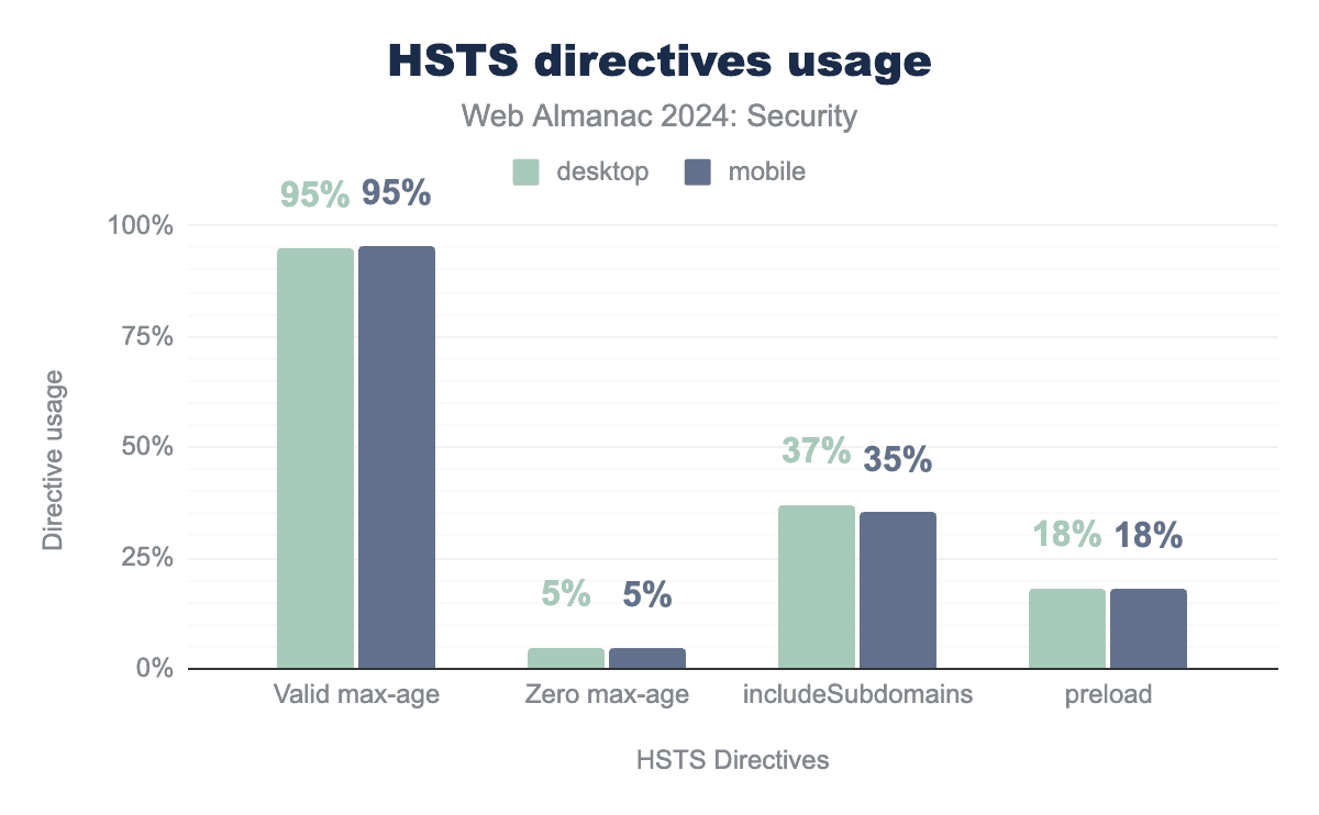 Zero max-ageはデスクトップとモバイルの両方でウェブサイトの5%で使用されています。Valid max-ageはデスクトップとモバイルの両方でウェブサイトの95%で使用されています。includeSubdomainsはデスクトップでウェブサイトの37%、モバイルでウェブサイトの35%で使用されています。preloadはモバイルとデスクトップの両方でウェブサイトの18%で使用されています。有効なmax-ageを持つリクエストの割合は95%で変わっていません。他のオプションのディレクティブ(includeSubdomainsとpreload)は、2022年と比較してそれぞれ1%わずかに増加し、モバイルでは35%と18%になりました。HSTS仕様の一部ではないpreloadディレクティブは、includeSubdomainsを設定する必要があり、また1年以上(または31,536,000秒)のmax-ageを必要とします。
