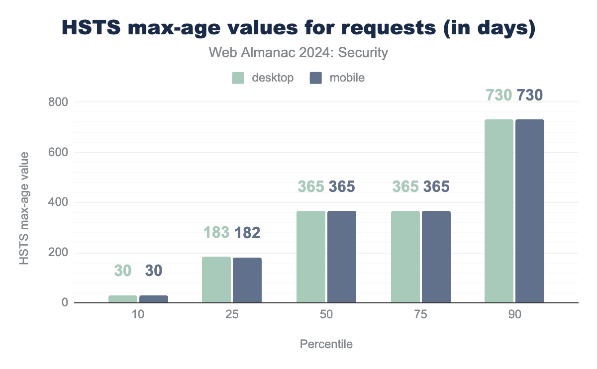 現在、モバイルのレスポンスの30%がHSTSヘッダーを持っており、これは2022年と比較して5%の増加です。ヘッダーのユーザーは、ヘッダー値にディレクティブを追加することで、ブラウザに指示を伝えることができます。max-ageディレクティブは必須です。これはブラウザに、ページをHTTPS経由でのみ訪問し続けるべき時間を秒単位で示します。