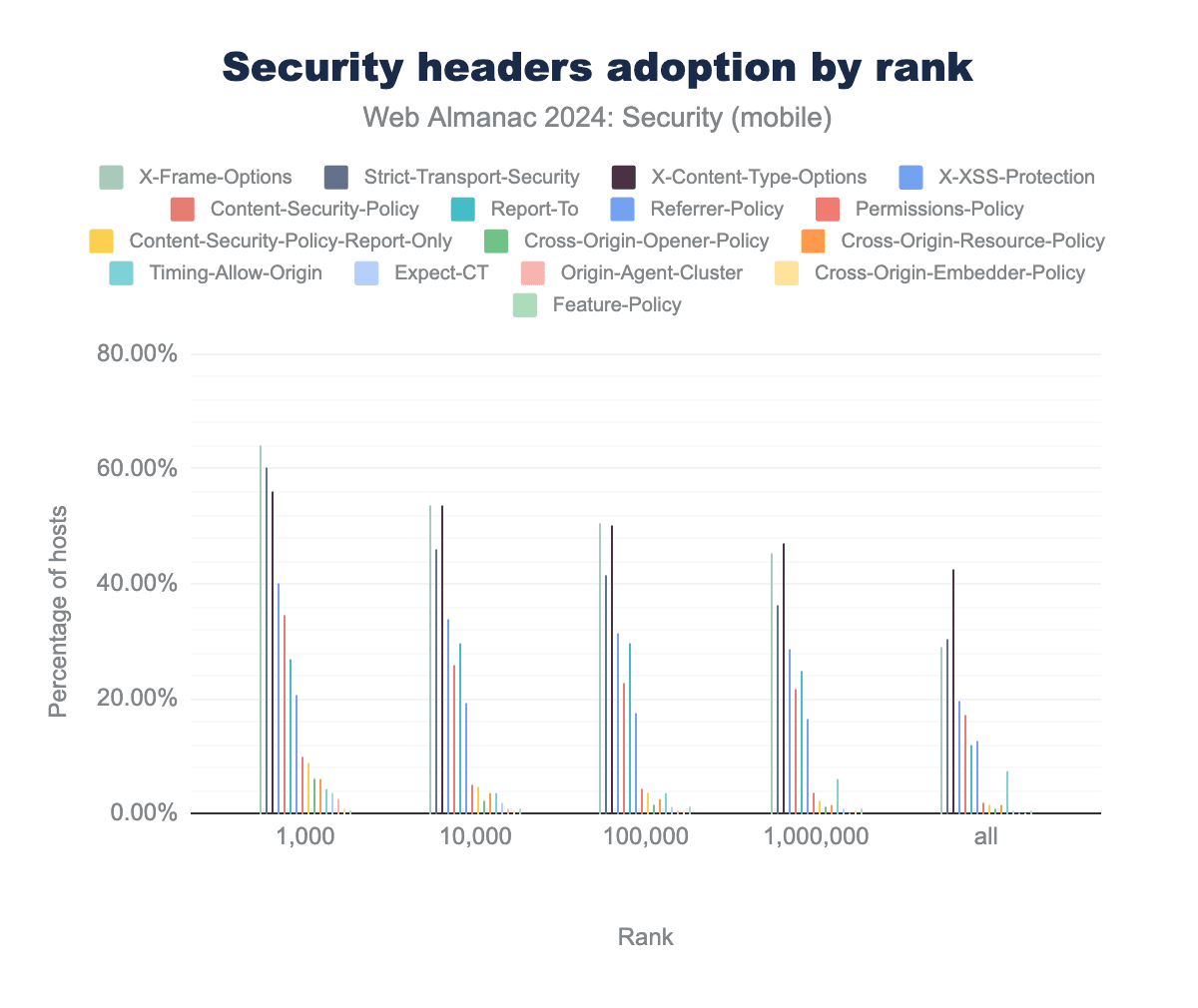 X-Frame-Options、Strict-Transport-Security、X-Content-Type-Options、X-XSS-Protection、Content-Security-Policyなど、もっとも人気のあるヘッダーを含むほとんどのヘッダーは、モバイルでより人気のあるサイトで常により高い採用率を示していることがわかります。モバイルの上位1000サイトの64.3%がHSTSを有効にしています。これは、上位1000のウェブサイトがHTTPS経由でのみトラフィックを送信することにより多くの投資をしていることを意味します。人気のないサイトでもHTTPSを有効にすることはできますが、Strict-Transport-Securityヘッダーを頻繁に追加しないため、ユーザーがプレーンHTTP経由で繰り返しサイトにアクセスする可能性があります。