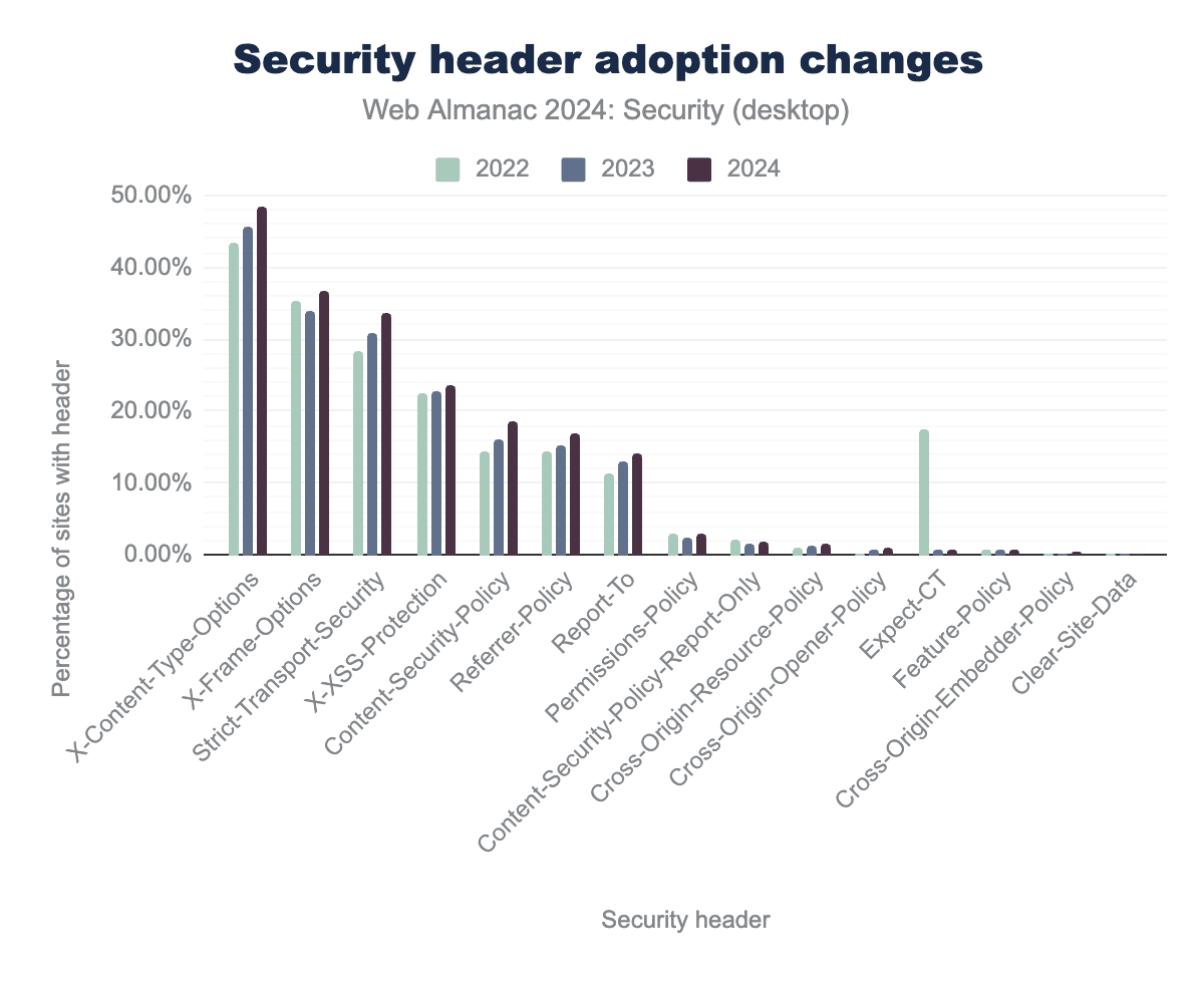 また、セキュリティ対策導入の推進要因を調査し、国、ウェブサイトのカテゴリ、技術スタックなどの要素が導入されているセキュリティ対策に影響を与えるかどうかを分析します。2022年版Web Almanacの調査結果と今年の調査結果を比較することで、主要な変化を浮き彫りにし、長期的な傾向を評価します。これにより、ウェブセキュリティ慣行の進化と長年にわたる進歩について、より広い視野を提供できます。