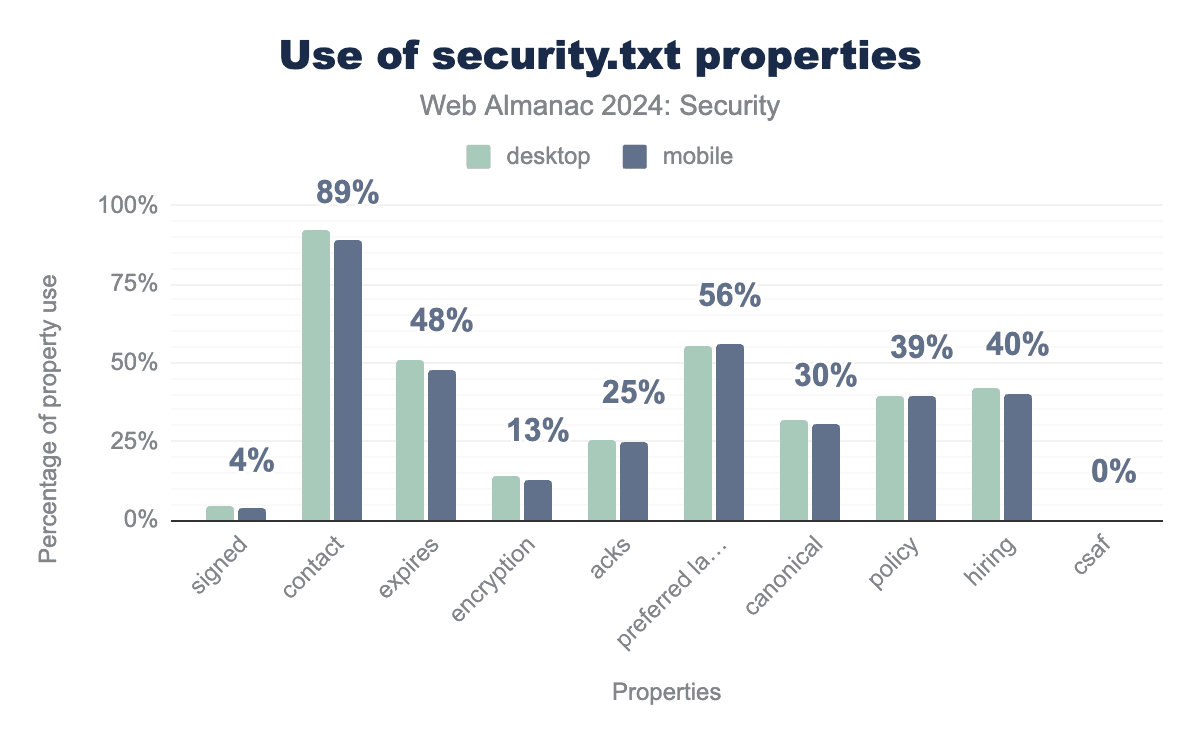signedはデスクトップとモバイルの両方でファイルの4%で使用されています。contactはデスクトップで92%、モバイルで89%のファイルで使用されています。expiresはデスクトップで51%、モバイルで48%のファイルで使用されています。encryptionはデスクトップで14%、モバイルで13%のファイルで使用されています。acksはデスクトップで26%、モバイルで25%のファイルで使用されています。preferred languageはデスクトップで55%、モバイルで56%のファイルで使用されています。canonicalはデスクトップで32%、モバイルで30%のファイルで使用されています。policyはデスクトップとモバイルの両方で39%のファイルで使用されています。csafはデスクトップとモバイルの両方で0%のファイルで使用されています。security.txtファイルのほとんどには、連絡先情報(88.8%)と優先言語(56.0%)が含まれています。今年は、security.txtファイルの47.9%が有効期限を定義しており、2022年の2.3%と比較して大幅に増加しています。これは、今年の分析ではステータスコード200のすべてのレスポンスではなくテキストファイルのみを含めるという方法論の更新によって大部分が説明でき、それによって誤検知率が大幅に低下します。これは、security.txtを使用しているサイトの半分未満しか、(他の要件の中でも)expiresプロパティを必須と定義している標準に従っていないことを意味します。興味深いことに、security.txtファイルの39%しかポリシーを定義していません。これは、脆弱性を見つけたホワイトハッカーが脆弱性を報告するためにどのような手順を踏むべきかを開発者が示すことができるスペースです。